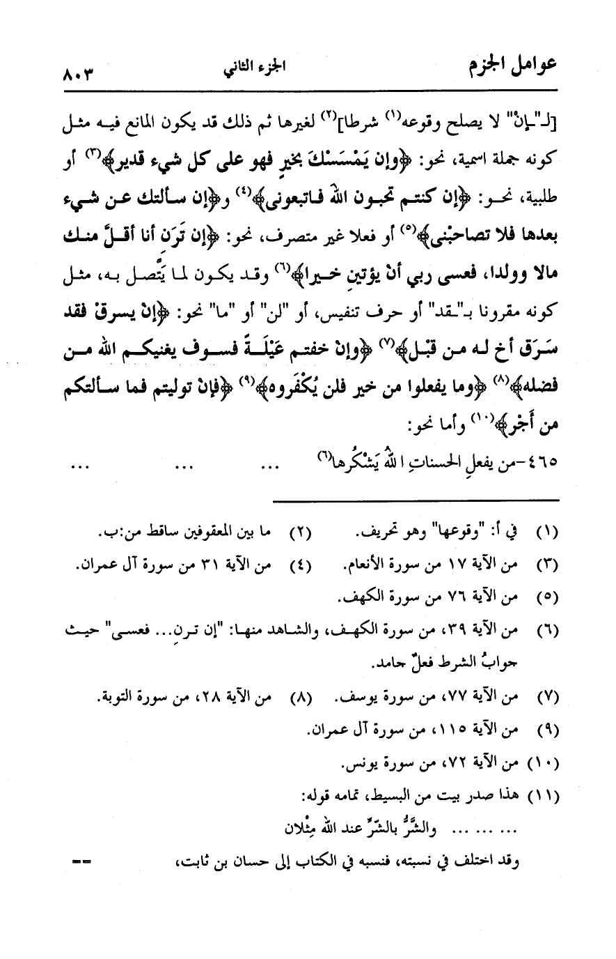 [لـ"إن" لا يصلح وقوعه شرطا] لغيرها ثم ذلك قد يكون المانع فيه مثل كونه جمله اسميه، نحو: {وَإِنْ يَمْسَسْكَ بِخَيْرٍ فَهُوَ عَلَى كُلِّ شَيْءٍ قَدِيرٌ} [الأنعام:17] أو طلبيه، نحو {قُلْ إِنْ كُنْتُمْ تُحِبُّونَ اللَّهَ فَاتَّبِعُونِي} [آل عمران:31] و {إِنْ سَأَلْتُكَ عَنْ شَيْءٍ بَعْدَهَا فَلا تُصَاحِبْنِي} [الكهف:76] أو فعلا غير متصرف، نحو: {إِنْ تَرَنِ أَنَا أَقَلَّ مِنْكَ مَالًا وَوَلَدًا (39) فَعَسَى رَبِّي أَنْ يُؤْتِيَنِ خَيْرًا} [الكهف:39 - 40] وقد يكون لما يتصل به، مثل كونه مقرونا بـ"قد" أو حرف تنفيس، أو "لن" أو "ما" نحو: {إِنْ يَسْرِقْ فَقَدْ سَرَقَ أَخٌ لَهُ مِنْ قَبْلُ} [يوسف:77] {وَإِنْ خِفْتُمْ عَيْلَةً فَسَوْفَ يُغْنِيكُمُ اللَّهُ مِنْ فَضْلِهِ} [التوبة:28] {وَمَا يَفْعَلُوا مِنْ خَيْرٍ فَلَنْ يُكْفَرُوهُ} [آل عمران:115] {فَإِنْ تَوَلَّيْتُمْ فَمَا سَأَلْتُكُمْ مِنْ أَجْرٍ} [يونس:72] وأما نحو: