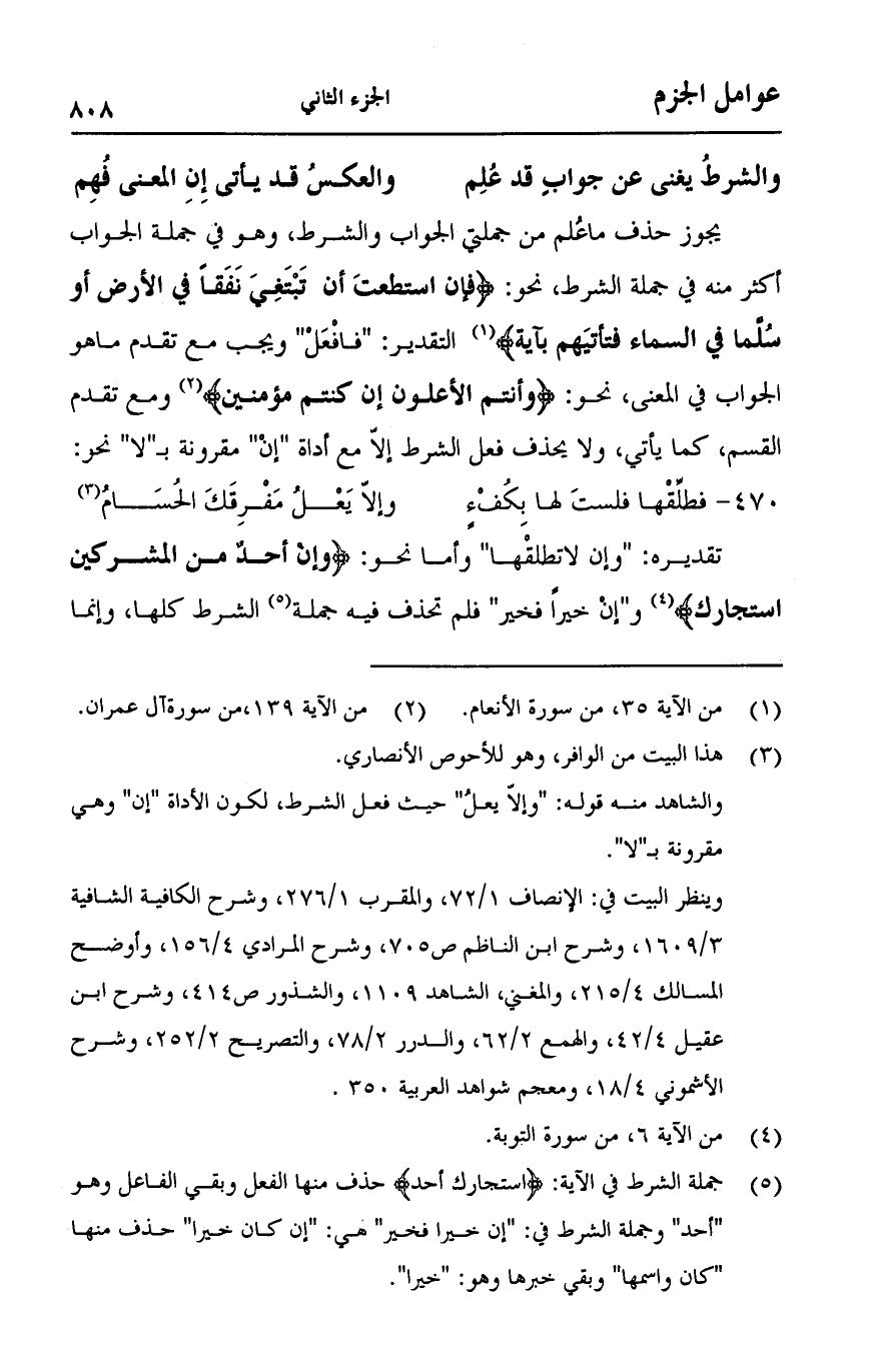 (والشرطُ يغني عن جوابِ قد عُلِم ... والعكسُ قد يأتي إنِ المعني فُهِم)