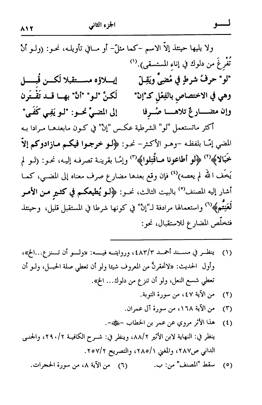 أكثر ما تستعمل "لو" الشرطيه عكس "إن" في كون ما بعدها مرادا به المضي إمّا بلفظه -وهو الأكثر- نحو: {لَوْ خَرَجُوا فِيكُمْ مَا زَادُوكُمْ إِلَّا خَبَالًا} [التوبة:47] {لَوْ أَطَاعُونَا مَا قُتِلُوا} [آل عمران:168] وإمّا بقرينه تصرفه إليه، نحو: (لو لم يَخَف الله لم يعصه) فإن وقع بعدها مضارع صرف معناه إلي المضي، كما أشار إليه المصنف بالبيت الثالث، نحو: {لَوْ يُطِيعُكُمْ فِي كَثِيرٍ مِنَ الأَمْرِ لَعَنِتُّمْ} [الحجرات:7] واستعمالها مرادفه لـ"إن" في كونها شرطا في المستقبل قليل، وحينئذ فتخلّص في المضارع للاستقبال، نحو: