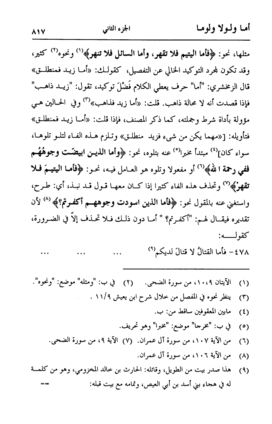 نحو: {فَأَمَّا الْيَتِيمَ فَلا تَقْهَرْ (9) وَأَمَّا السَّائِلَ فَلا تَنْهَرْ} [الضحى:9 - 10] ونحوه كثير، وقد تكون لمجرد التوكيد الخالي عن التفصيل، كقولك: "أما زيد فمنطلق" قال الزمخشيري: "أما" حرف يعطي الكلام فَضْلَ توكيد، تقول: "زيد ذاهب" فإذا قصدت أنه لا محالة ذاهب. قلت: "أما زيد فذاهب" وفي الحالين هي مؤؤلة بأداة شرط وجملته، كما ذكر المصنف، فإذا قلت: "أما زيد فمنطلق" فتأويله: ["مهما يكن من شيء فزيد منطلق" وتلزم هذه الفاء لتلو تلوها، سواء كان] مبتدأ مخبرا عنه بتلوه، نحو: {وَأَمَّا الَّذِينَ ابْيَضَّتْ وُجُوهُهُمْ فَفِي رَحْمَةِ اللَّهِ} [آل عمران:107] أو مفعولا وتلوه هو العامل فيه، نحو: {فَأَمَّا الْيَتِيمَ فَلا تَقْهَرْ} [الضحى:9] وتحذف هذه الفاء كثيرا إذا كان معها قول قد نبذ، أي: طرح، واستغني عنه بالمقول نحو: {فَأَمَّا الَّذِينَ اسْوَدَّتْ وُجُوهُهُمْ أَكَفَرْتُمْ} [آل عمران:106] لأن تقديره فيقال لهم: "كفرتم؟ " أما دون ذلك فلا تحذف إلا في الضرورة، كقوله:
