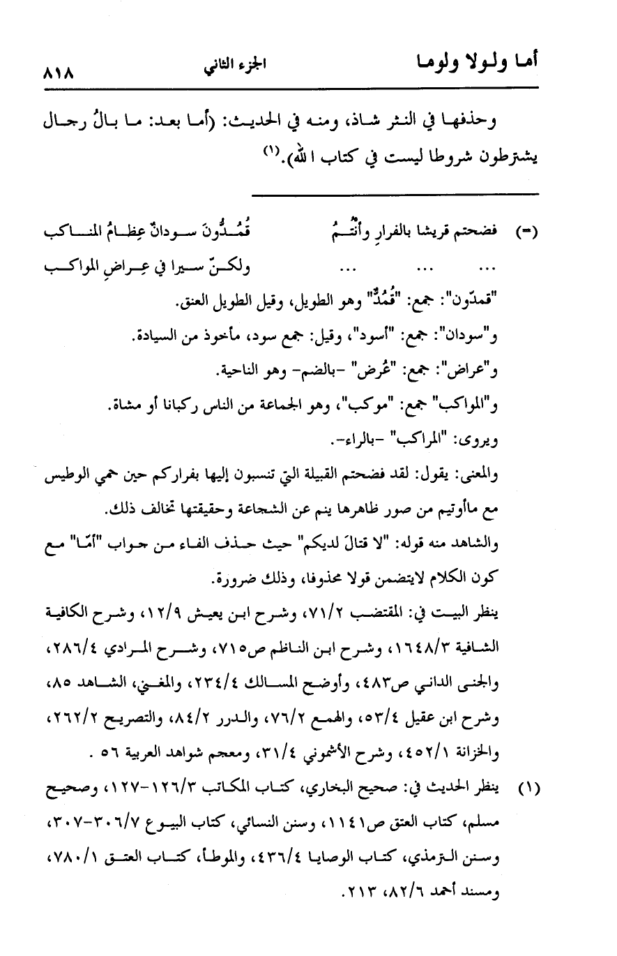 وحذفها في النثر شاذ, ومنه في الحديث: (أما بعد: ما بالُ رجال يشترطون شروطا ليست في كتاب الله).