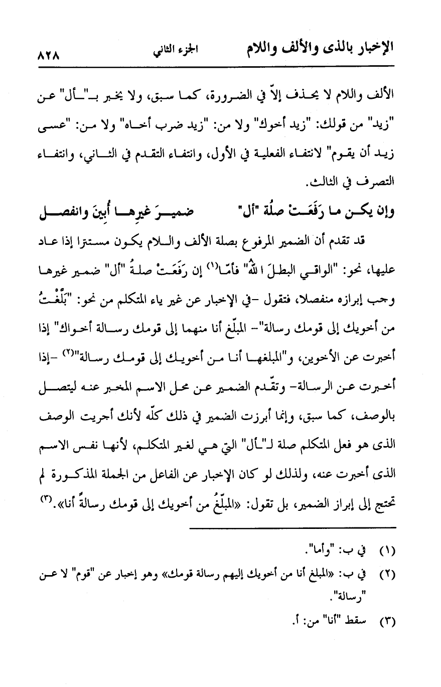 قد تقدم أن الضمير المرفوع بصلة الألف واللام يكون مستترا إذا عاد عليها, نحو: "الواقي البطلَ اللهُ" فأمّا إن رَفَعَتْ صلةُ "أل" ضمير غيرها وجب إبرازه منفصلا, فتقول -في الإخبار عن غير ياء المتكلم من نحو: "بَلْغْتُ من أخويك إلى قومك رسالة" -المبلغ أنا منهما إلى قومك رسالة أخوك" إذا أخبرت عن الأخوين, و"المبلغها أنا من أخويك إلى قومك رسالة" -إذا أخبرت عن رسالة- وتقّدم الضمير عن محل الاسم المخبر عنه ليتصل بالوصف, كما سبق, وإنما أبرزت الضمير في ذلك كلّه لأنك أجريت الوصف الذي هو فعل المتكلم صلة لـ"ــأل" التي هي لغير المتكلم, لأنها نفس الاسم الذي أخبرت عنه, ولذلك لو كان الإخبار عن الفاعل من الجملة المذكورة لم تحتج إلى إبراز الضمير, بل تقول: "المبلّغُ من أخويك إلى قومك رسالةً أنا".