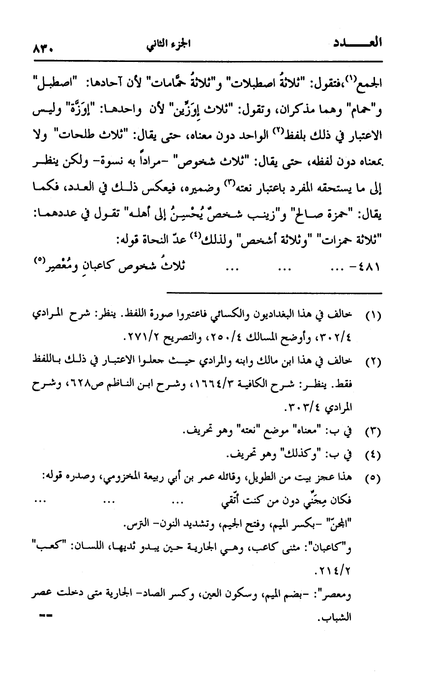 الجمع, فتقول: "ثلاثةُ اصطبلات" و"ثلاثةُ حمَّامات" لأن آحادها: "أصطبل" و"حمام" وهما مذكران, وتقول: "ثلاث إِوَزِّين" لأن واحدها: "إوَزَّة" وليس الاعتبار في ذلك بلفظ الواحد دون معناه, حتى يقال: "ثلاث طلحات" ولا بمعناه دون لفظه, حتى يقال: "ثلاث شخوص" -مراداً به نسوة- ولكن ينظر إلى ما يستحقه المفرد باعتبار نعته وضميره, فيعكس ذلك في العدد, فكما يقال: "حمزة صالح" و"زينب شخصٌ يُحْسِنُ إلى أهله" تقول في عددهما: "ثلاثة حمزات" "وثلاثة أشخص" ولذلك عدّ النحاة قوله: