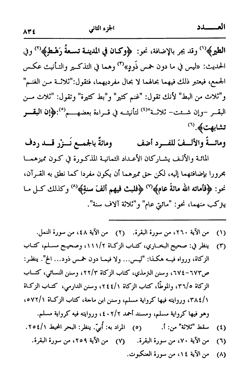 الطَّيْرِ} وقد يجر بالإضافة, نحو: {وَكَانَ فِي الْمَدِينَةِ تِسْعَةُ رَهْطٍ} [النمل:48] وفي الحديث: "ليس في ما دون خمس ذَودٍ" وهما في التذكير والتأنيث عكس الجمع, فيعتبر ذلك فيهما بحالهما لا بحال مفرديهما, فتقول: "ثلاثة من الغنم" و"ثلاث من البط" لأنك تقول: "غنم كثير" و"بط كثيرة" وتقول: "ثلاث من البقر- وإن شئت- ثلاثة" لتأنيثه في قراءة بعضهم: {إِنَّ الْبَقَرَ تَشَابَهَ} [البقرة:70].