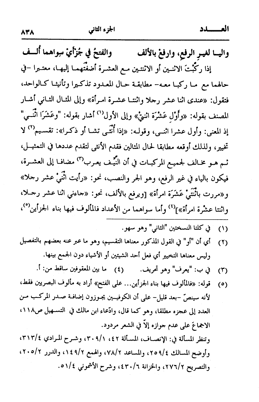 إذا ركبتَ الاثنين أو الاثنتين مع العشرة أضفتهما إليها, معتبرا -في حالهما مع ما ركبا معه- مطابقة حال المعدود تذكيرا وتأنيثا كالواحد, فتقول: "عندي اثنا عشر رجلا واثنتا عشرة امرأة" وإلى المثال الثاني أشار المصنف بقوله: "وأوْلِ عَشْرَة اثنتْي" وإلى الأول أشار بقوله: "وعَشَرَا اثْنَي" إذ المعنى: وأول عشرا اثنى, وقوله: "إذا أُنثى تشا أو ذكرا": تقسيم لا تخيير, ولذلك أوقعه مطابقا لحال المثالين فقدم الأنثى لتقديم عددها في التمثيل, قم هو مخالف لجميع المركبات في أن النَّيَّف يعرب مضافا إلى العشرة, فيكون بالياء في غير الرفع, وهو الجر والنصب, نحو: "رأيت اثنيْ عشر رجلا" و "مررت باثْنَيْ عَشَرة امرأة" [ويرفع بالألف, نحو: "جاءني اثنا عشر رجلا, واثنتا عشرة امرأة"] وأما سواهما من الأعداد فالمألوف فيها بناء الجزأين.