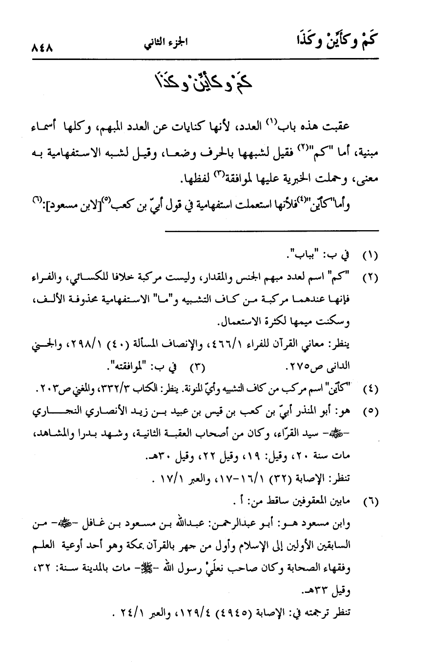 عقبت هذه باب العدد, لأنها كنايات عن العدد المبهم, وكلها أسماء مبنية, أما "كم" فقيل لشبهها بالحرف وضعا, وقيل لشبه الاستفهامية به معنى, وحملت الخبرية عليها لموافقة لفظها.