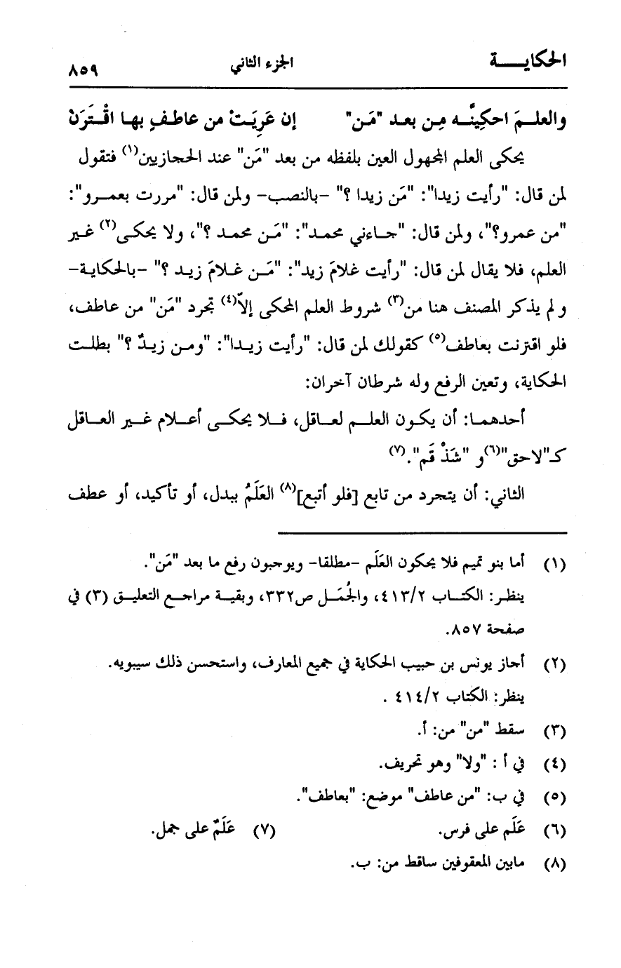 يحكى العلم المجهول العين بلفظه من بعد "من" عند الحجازيين فتقول لمن قال: "رأيت زيدا": مَن زيداظ -بالنصب- ولمن قال: "مررت بعمرو": "من عمرو؟ ", ولمن قال: جاءني محمد": مَن حمد؟ ", ولا يحكى غير العلم, فلا يقال لمن قال: "رأيت غلامَ زيد": "من غلام زيد؟ " -بالحكاية- ولم يذكر المصنف هنا من شروط العلم المحكى إلاّ تجرد "مَن" من عاطف, فلو اقترنت بعاطف كقولك لمن قال: "رأيت زيدا": "ومن زيدُ؟ " بطلت الحكاية, وتعين الرفع وله شرطان آخران: