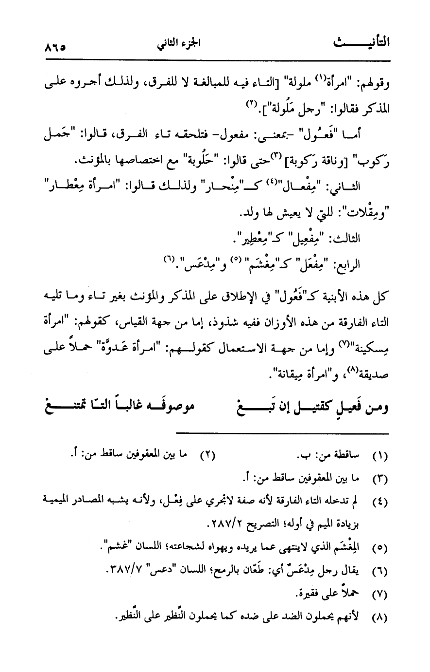 أما "فَعُول" - بمعنى: مفعول- فتلحقه تاء الفرق، قالوا: "جَمل رَكوب" [وناقة رَكوبة] حتى قالوا: "حَلُوبة" مع اختصاصها بالمؤنث.