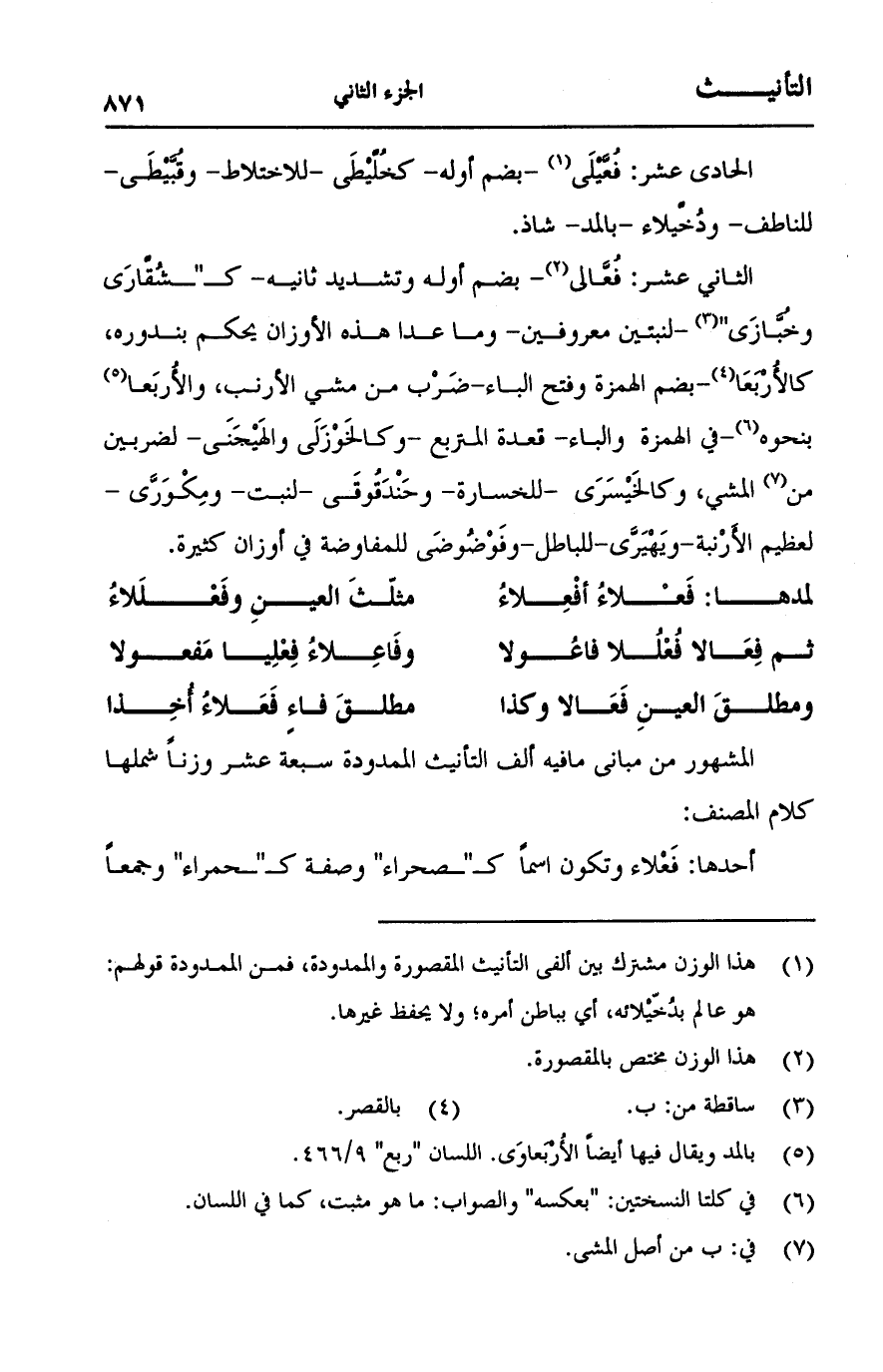 الثاني عشر: فُعَّالى -بضم أوله وتشديد ثانيه- كـ "شُقَّارى وخُبَّازى" -لنبتين معروفين- وما عدا هذه الأوزان يحكم بندوره، كالأُرْبَعَا -بضم الهمزة وفتح الباء- ضَرْب من مشي الأرنب، والأُربَعا بنحوه - في الهمزة والباء - قعدة المتربع- وكالخَوْزَلَى والهَيْجَنَى - لضربين من المشي، وكالخَيْسَرَى - للخسارة- وحَنْدَقُوقَى - لنبت- ومِكْوَرَّى- لعظيم الأَرْنبة - ويَهْيَرَّى- للباطل- وفَوْضُوضَى للمفاوضة في أوزان كثيرة.