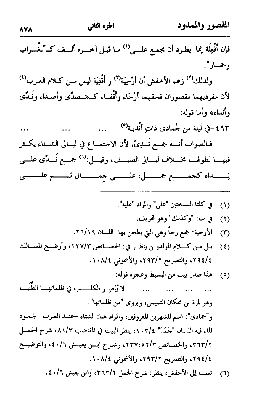 ولذلك زعم الأخفش أن أرْحِيَة وأَقْفِيَة ليس من كلام العرب لأن مفرديهما مقصوران فحقهما أرْحَاء وأَقْفاء كـ "صدِّى وأصداء ونَدِّى وأنداء" وأما قوله: