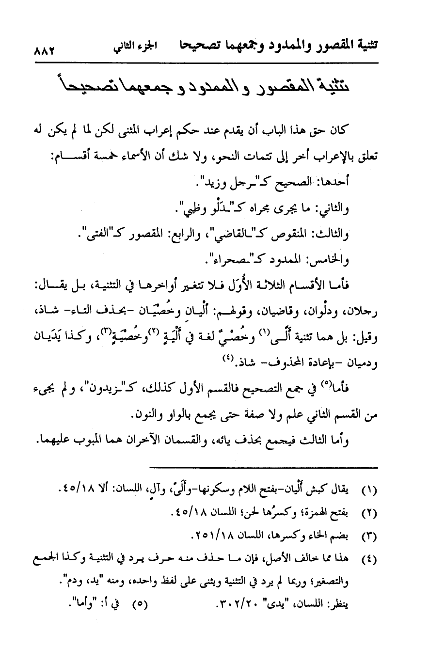 فأما الأقسام الثلاثة الأول فلا تتغير أواخرها في التثنية، بل يقال: رجلان، ودْلوان، وقاضيان، وقولهم: ألْيانِ وخُصْيَان -بحذف التاء- شاذ، وقيل: بل هما تثنية أَلِّى وخُصْيٌ لغة في أَلْيَةٍ وخُصْيَةٍ، وكذا يَدَيان ودميان -بإعادة المحذوف- شاذ.