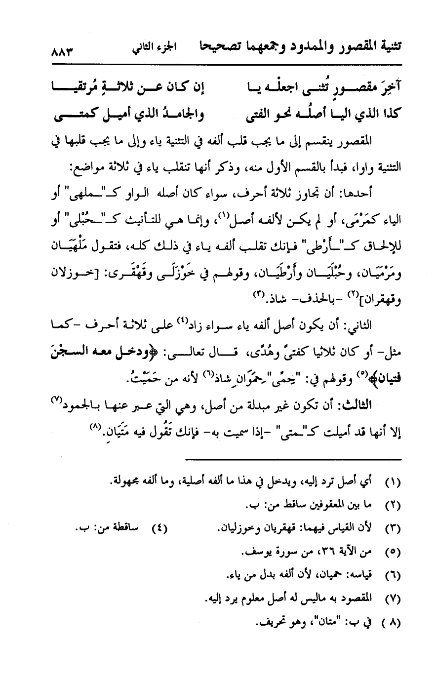 المقصور ينقسم إلى ما يجب قلب ألفه في التثنية ياء وإلى ما يجب قلبها في التثنية واواً، فبدأ القسم الأول منه، وذكر أنها تنقلب ياء في ثلاثة مواضع: