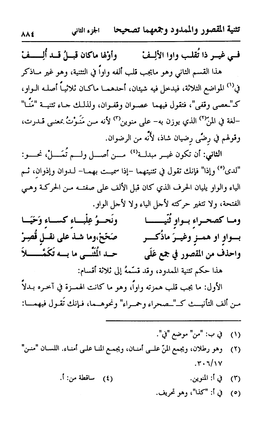 هذا القسم الثاني وهو ما يجب قلب ألفه واواً في التثنية، وهو غير ما ذكر في المواضع الثلاثة، فيدخل فيه شيئان، أحدهما ما كان ثلاثياً أصله الواو، كـ "عصى وقفى"، فتقول فيهما عصوان وقفوان، ولذلك جاء تثنية "مَنَّا"-لغة في المنّ الذي يوزن به- على منوين لأنه من مَنَوْتُ بمعنى قدرت، وقولهم في رِضِّى رِضيان شاذ، لأنه من الرضوان.