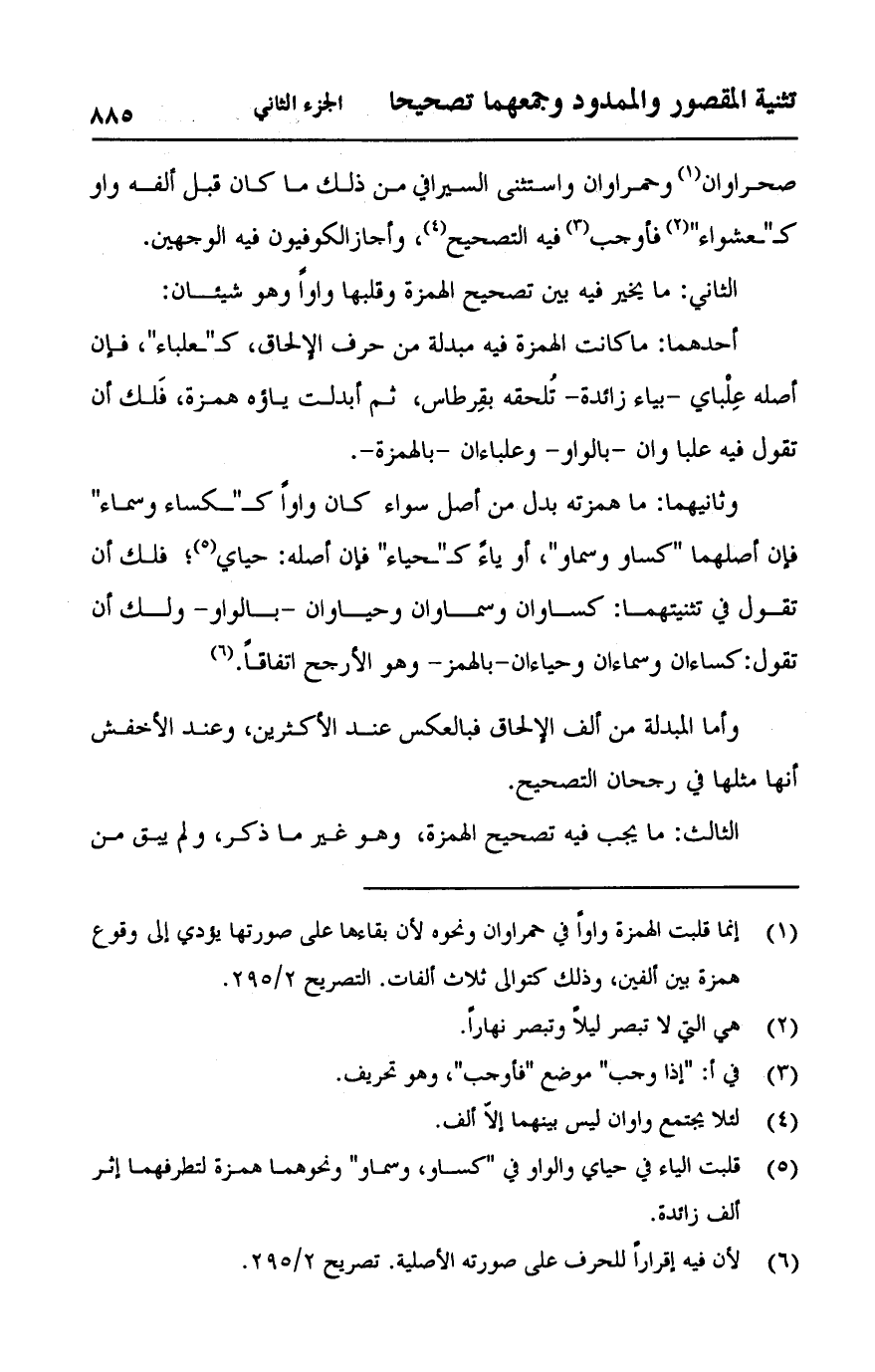 صحراوان وحمراوان واستثنى السيرافي من ذلك ما كان قبل ألفه واو كـ "عشواء" فأوجب فيه التصحيح، وأجاز الكوفيون فيه الوجهين: