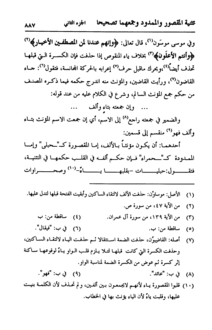 وفي موسى موسون، قال تعالى: {وَإِنَّهُمْ عِنْدنَا لَمِنْ الْمُصْطَفَيْنَ الْأَخْيَار} [ص:47] {وَأَنتُمُ الأَعْلَوْنَ} [آل عمران:139] بخلاف ياء المنقوص إذا حذفت فإن الكسرة التي قبلها تحذف أيضاً، ويحرك ما قبل حرف إعرابه بالحركة المجانسة، فتقول: جاء القاضون، ورأيت القاضين، والمؤنث منه اندرج حكمه فيما ذكره المصنف من حكم جمع المؤنث السالم، وشرع في الكلام عليه من عند قوله:
