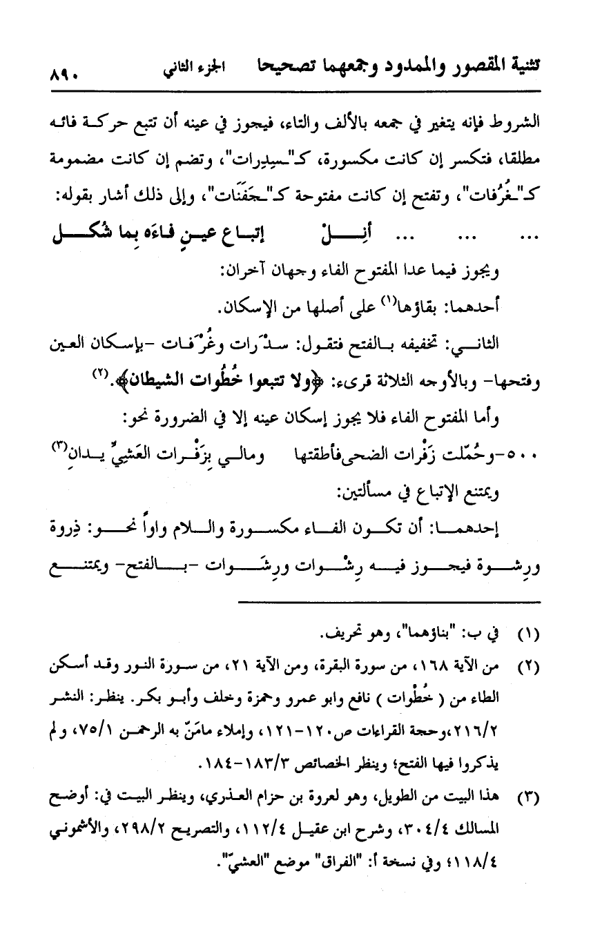 الثاني: تخفيفه بالفتح فتقول: سدْرَات وغًرْفَات -بإسكان العين وفتحها- وبالأوجه الثلاثى قراء: {وَلَا تَتَّبِعُوا خُطُوَاتِ الشَّيْطَانِ} [البقرة:168] [النور:21].