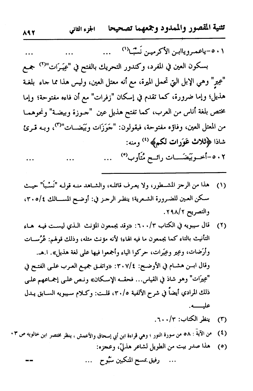 بسكون العين في المفرد, ومندور التحريك بالفتح في "عيرات" جمع "عير" وهي الإبل التي تحمل الميرة, مع أنه معتل العين, وليس هذا مما جاء بلغة هذيل؛ وإما ضرورة, كما تقدم في إسكان "زفرات" مع أن فاءه مفتوحة؛ وإما مختص بلغة أناس من العرب, كما تفتح هذيل عين "جوزة وبيضة" ونحوهما من المعتل العين, وفاؤه مفتوحة, فيقولون: "جوزات وبيضات", وبه قرئ شاذا} ثلاث عَوَرات لكم {ومنه: