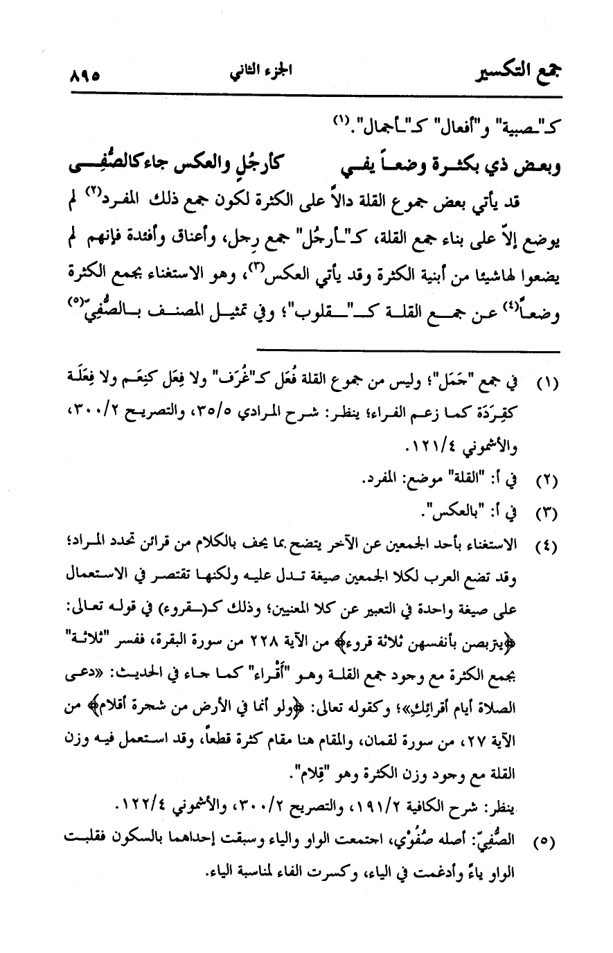قد يأتي بعض جموع القلة دالاً على الكثر جمع ذلك المفرد لم يوضع إلاّ على بناء جمع القلة, كـ"أرجل" جمع رجل, وأعناق وأفئدة فإنهم لم يضعوا لها شيئا من أبنية الكثرة وقد يأتي العكس, وهو الاستغناء بجمع الكثرة وضعاً عن جمع القلة كـ"قلوب"؛ وفي تمثيل المصنف بالصفِي