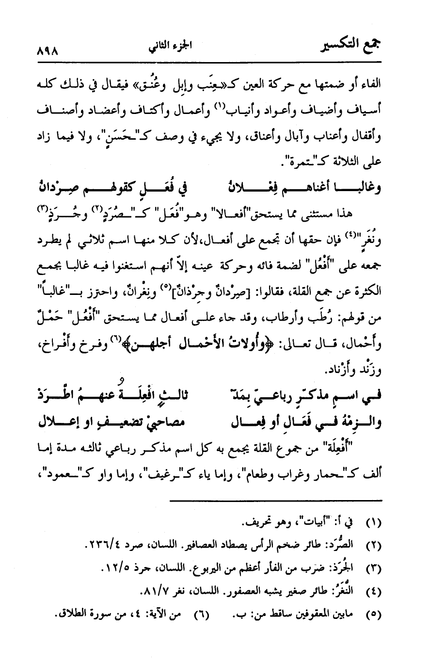 هذه مستثنى مما يستحق "أفعالا", وهو "فعل" كـ"صرد" وجرذٍ ونغرٍ فإن حقها أن تجمع على أفعال, لأن كلا منها اسم ثلاثي لم يطرد جمعه على "أفعل" لضمة فائه وحركة عينه إلاّ أنهم استغنوا فيه غالبا بجمع الكثرة عن جمع القلة, فقالوا: [صِردان وجِرذان] ونغرانٌ, واحترز بـ"غالباً" من قولهم: رطب وأرطاب, وقد جاء على أفعال مما يستحق "أفعل" حمل وأحمال, قال تعالى:} وأولات الأحمال أجهلن {وفرخ وأفراخ, وزند وأزناد.