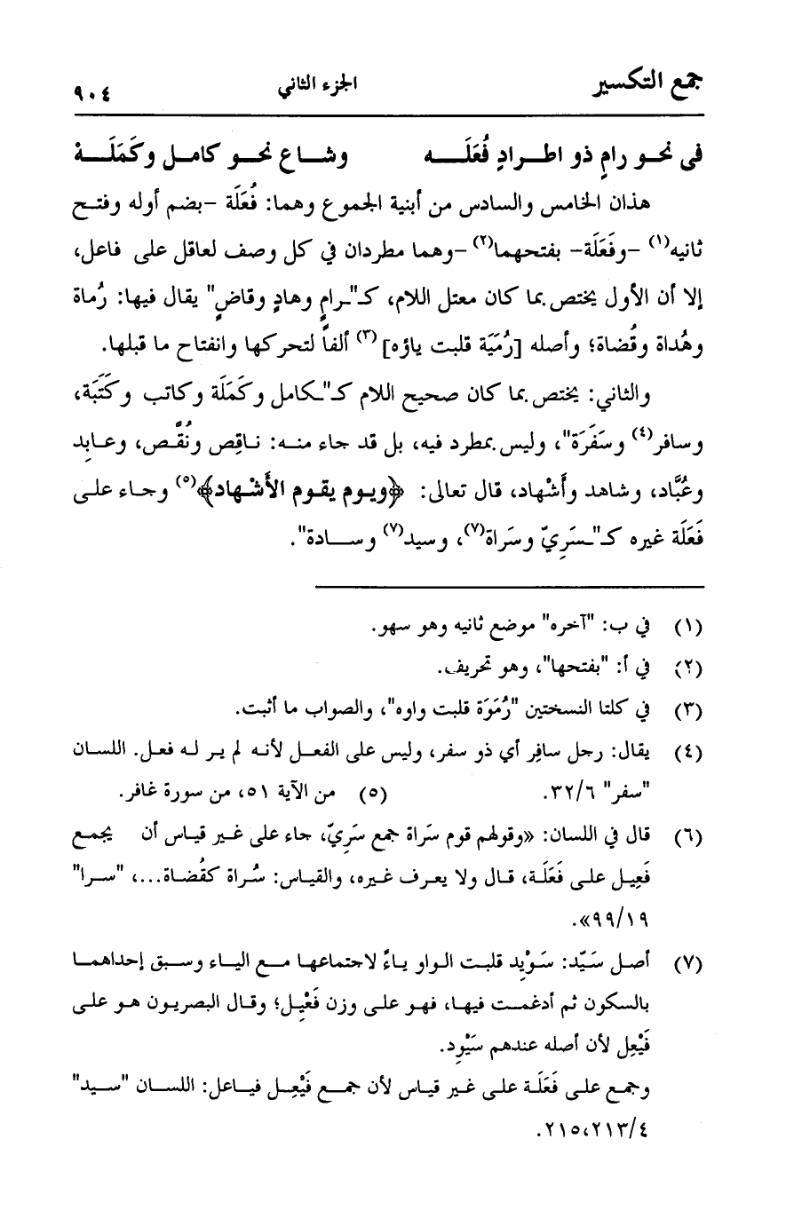 والثاني: يختص بما كان صحيح اللام كـ "كامل" وكملة وكاتب وكتبة، وسافر وسفرة، وليس بمطرد فيه، بل قد جاء منه: ناقص ونقص، وعابد وعباد، وشاهد وأشهاد، قال تعالى: {وَيَوْمَ يَقُومُ الأَشْهَادُ} [غافر: 51] وجاء على فعلة غيره كـ "سري وسراة، وسيد وسادة".