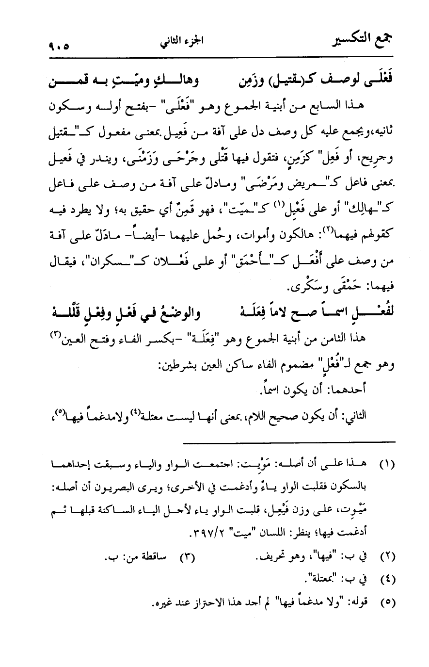 هذا السابع من أبنية الجموع وهو "فعلى"- بفتح أوله وسكون ثانيه، ويجمع عليه كل وصف دل على آفة من فعيل بمعنى مفعول كـ "قتيل وجريح، أو فعل" كزمنٍ، فتقول فيهل قتلى وجرحى وزمنى، ويندر فيه فعيل بمعنى فاعل كـ "مريض ومرضى" وما دل على آفة من وصف على فاعل كـ "هالك" أو على فعيل كـ "ميت" فهو قمن أي حقيق به؛ ولا يطرد فيه كقولهم فيهما: هالكون وأموات، وحمل عليهما -أيضًا- ما دل على آفة من وصف على أفعل كـ "أحمق" أو على فعلان كـ "سكران"، فيقال فيهما: حمقى وسكرى.