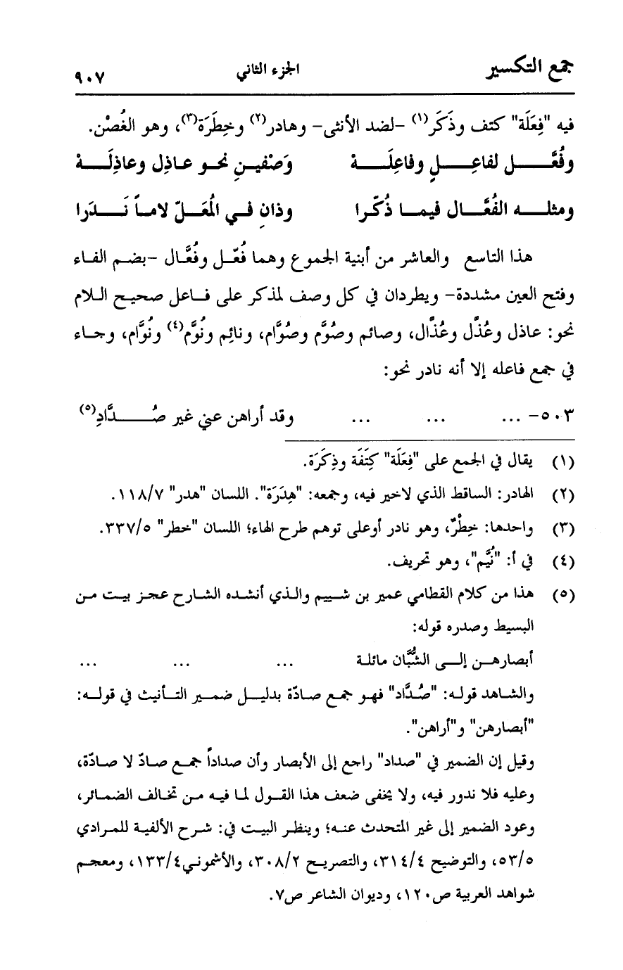 هذا التاسع والعاشر من أبنية الجموع وهما فعل وفعال -بضم الفاء وفتح العين مشددة- ويطردان في كل وصف لمذكر على فاعل صحيح اللام نحو: عاذل وعذل وعذال، وصائم وصوم وصوام، ونائم ونوم ونوام، وجاء في جمع فاعله إلا أنه نادر نحو: