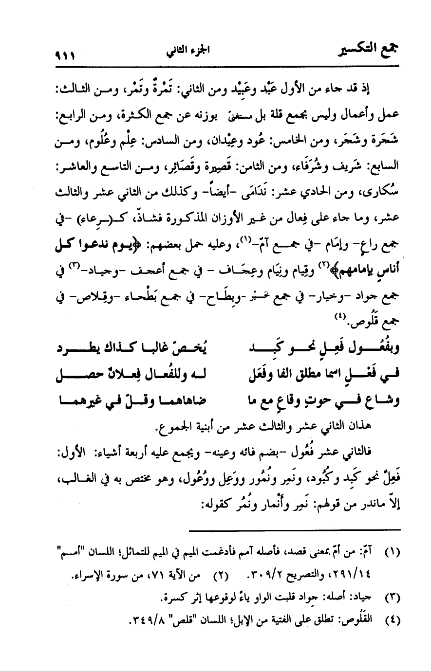 إذ قد جاء من الأول عبد وعبيد ومن الثاني: تمرة وتمر، ومن الثالث: عمل وأعمال وليس بجمع قلة بل مستغنى بوزنه عن جمع الكثرة، ومن الرابع: شجرة وشجر، ومن الخامس: عود وعيدان، ومن السادس: علم وعلوم، ومن السابع: شريف وشرفاء، ومن الثامن: قصيرة وقصائر، ومن التاسع والعاشر: سكارى، ومن الحادي عشر: ندامى -أيضاً- وكذلك من الثاني عشر والثالث عشر، وما جاء على فعال من غير الأوزان المذكورة فشاذ، كـ (ـرعاء) -في جمع راعٍ- وإمام -في جمع آم-، وعليه حمل بعضهم: {يَوْمَ نَدْعُوا كُلَّ أُنَاسٍ بِإِمَامِهِمْ} [الإسراء: 71]-وقيام ونيام وعجاف- في جمع أعجف -وجياد- في جمع جواد -وخيار- في جمع خير -وبطاح- في جمع بطحاء -وقلاص- في جمع قلوص.