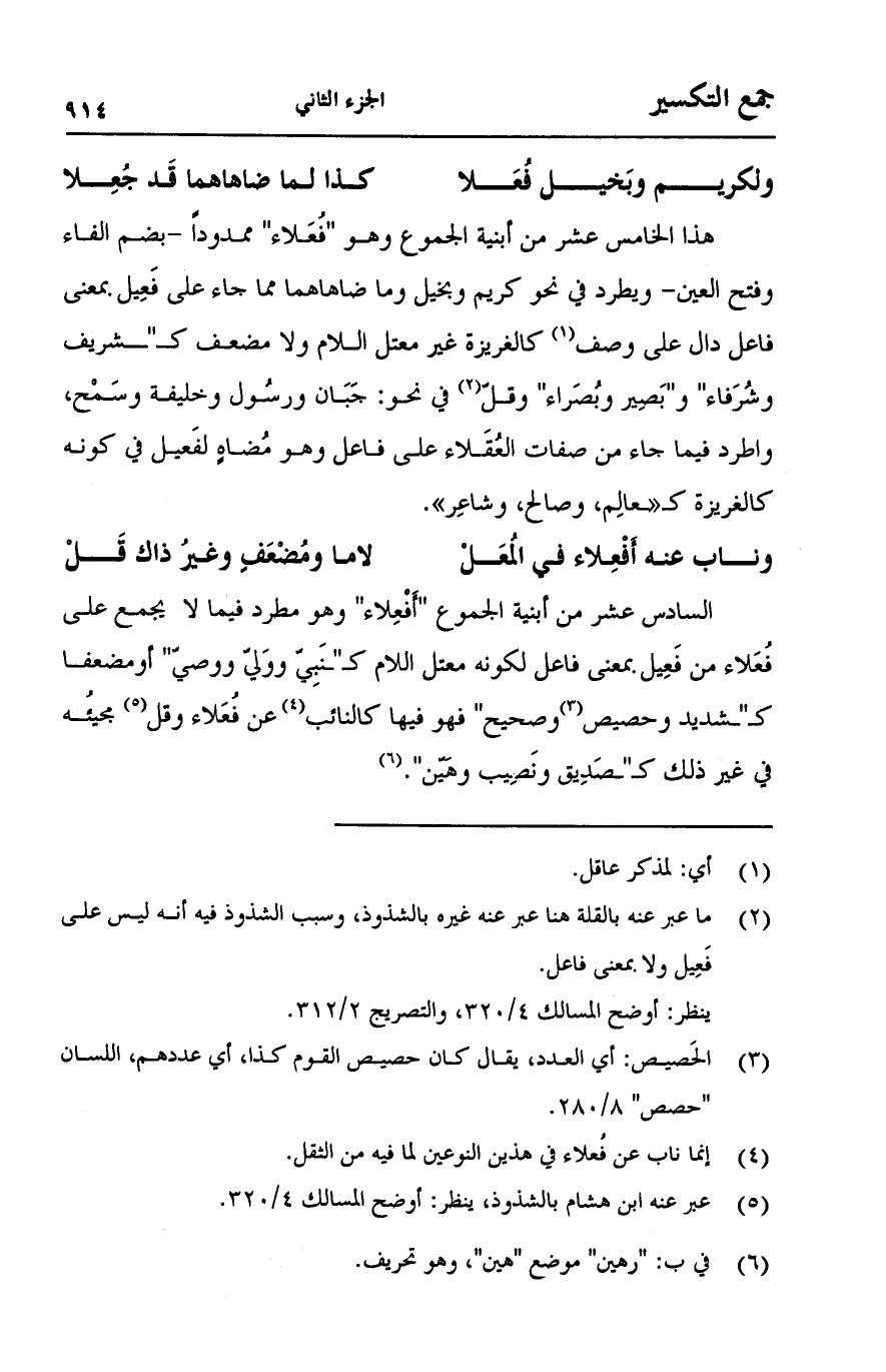 السادس عسر من أبنية الجموع "أفعلاء" وهو مطرد فيما لا يجمع على فعلاء من فعيل بمعنى فاعل لكونه معتل اللام كـ "ـنبي وولي ووصي" أو مضعفا كـ "ـشديد وحصيص وصحيح" فهو فيها كالنائب عن فعلاء وقل مجيئه في غير ذلك كـ "ـصديق ونصيب وهين".
