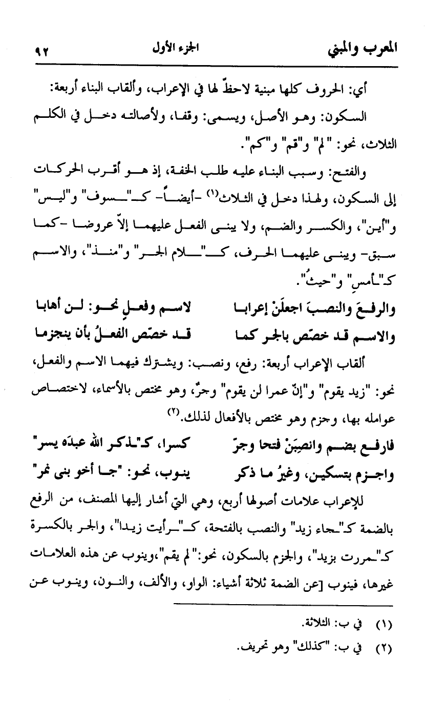 للإعراب علامات أصولها أربع، وهي التي أشار إليها المصنف، من الرفع بالضمة كـ"جاء زيد" والنصب بالفتحة، كـ ـ"رأيت زيداً"، والجر بالكسرة كـ "مررت بزيد"، والجزم بالسكون، نحو: "لم يقم" وينوب عن هذه العلامات غيرها، فينوب] عن الضمة ثلاثة أشياء: الواو، والأنف، والنون، وينوب عن