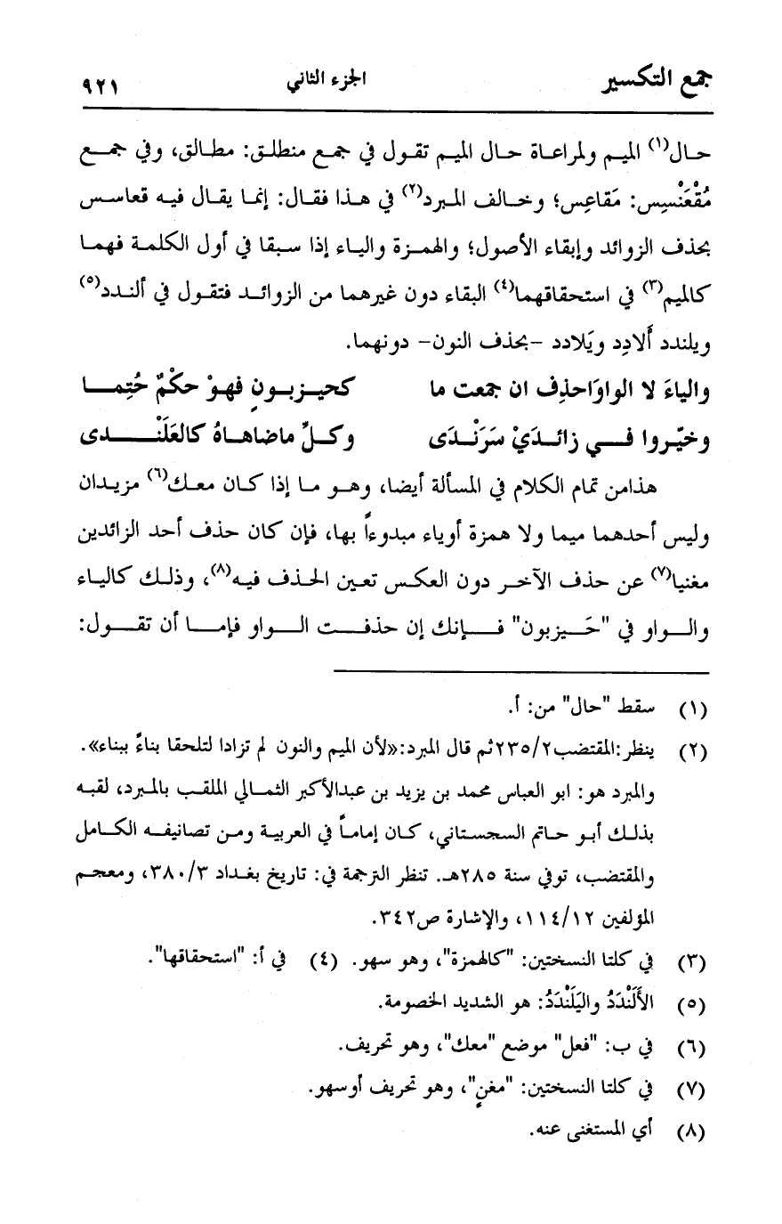 حال الميم ولمراعاة حال الميم تقول في جمع منطلق: مطالق، وفي جمع مقعنس: مقاعس؛ وخالف المبرد في هذا فقال: إنما يقال فيه قعاسس بحذف الزوائد وإبقاء الأصول؛ والهمزة والياء إذا سبقا في أول الكلمة فهما كالميم في استحقاقهما البقاء دون غيرهما من الزوائد فتقول في الندد ويلندد ألادد ويلادد -بحذف النون- دونهما.