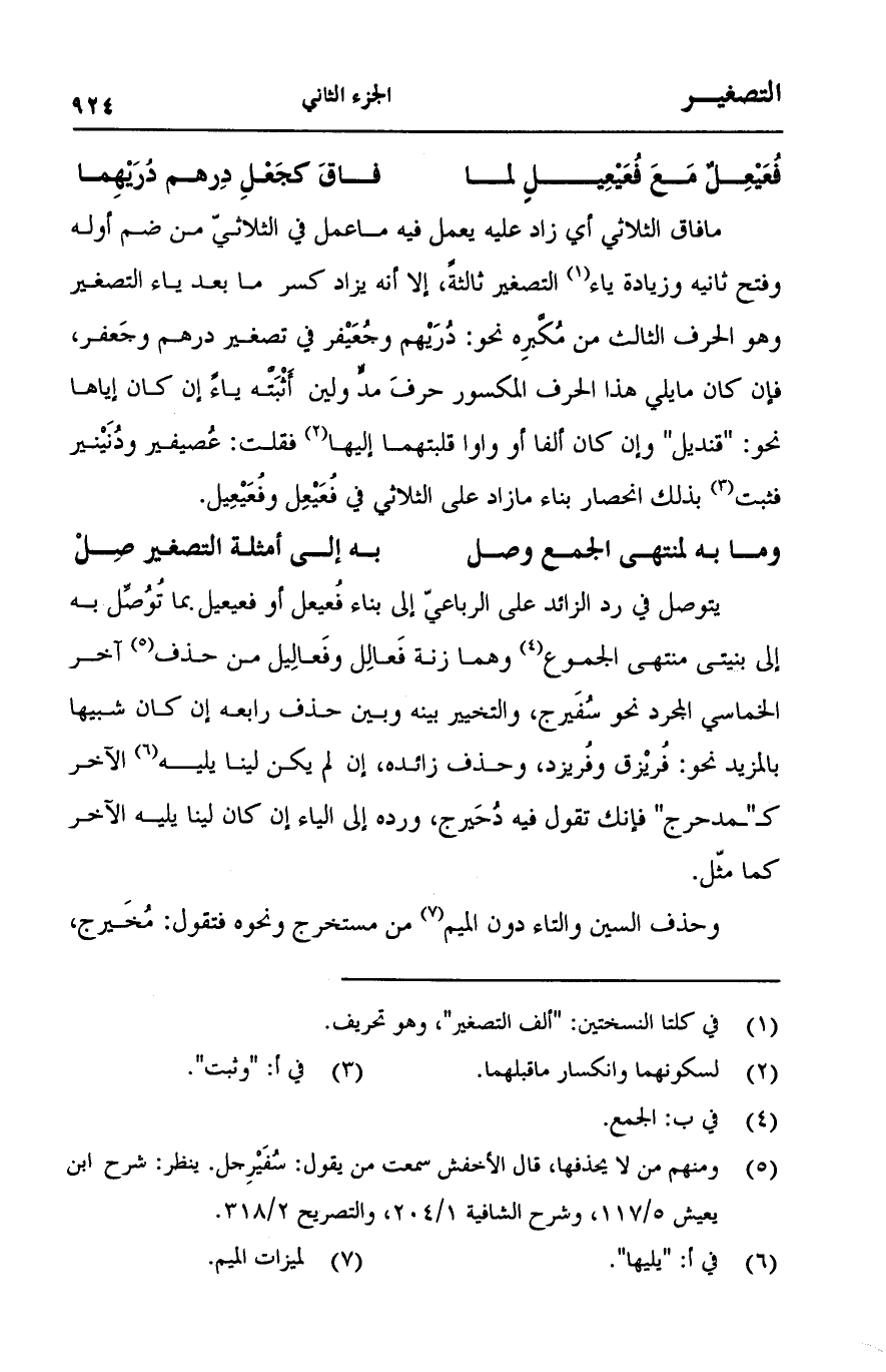 ما فاق الثلاثي أي زاد عليه يعمل فيه ما عمل في الثلاثي من ضم أوله وفتح ثانيه وزيادة ياء التصغير ثالثةً، إلا أنه يزاد كسر ما بعد ياء التصغير وهو الحرف الثالث من مكبره نحو: دريهم وجعيفر في تصغير درهم وجعفر، فإن كان ما يلي هذا الحرف المكسور حرف مد ولين أثبته ياءً إن كان إياها نحو "قنديل" وإن كان ألفاً أو واو قلبتهما إليها فقلت: عصيفير دنينير فثبت بذلك انحصار بناء ما زاد على الثلاثي في فعيعل وفعيعيل.