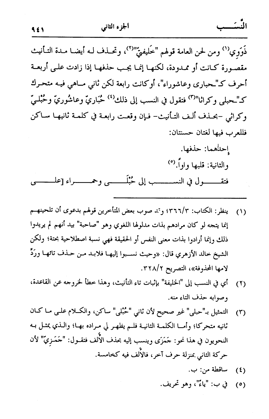 ذووي ومن لحن العامة قولهم "خليفتي"، وتحذف له أيضاً مدة التأنيث مقصورة كانت أو ممدودة، لكنها إنما يجب حذفها إذا زادت على أربعة أحرف كـ"حبارى وعاشوراء"، أو كانت رابعة لكن ثاني ما هي فيه متحرك كـ"ـحبلى وكراثا" فتقول في النسب إلى ذلك حباري وعاشوري وحبلي وكراثي -بحذف ألف التأنيث- فإن وقعت رابعة في كلمة ثانيها ساكن فللعرب فيها لغتان حسنتان:
