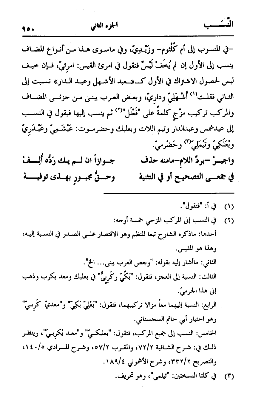 -في المنسوب إلى أن كلثوم- وزيدي، وفي ما سوى هذا من أنواع المضاف ينسب إلى الأول إن لم يخف لبس فتقول في امرئ القيس: امرئي، فإن خيف لبس لحصول الاشتراك في الأول كـ "ـعبد الأشهل وعبد الدار" نسبت إلى الثاني فقلت أشهلي وداري، وبعض العرب بيني من جزئي المضاف والمركب تركيب مزجٍ كلمةً على "فعلل" ثم ينسب إليها فيقول في النسب إلى عبد شمس وعبد الدار وتيم اللات وبعلبك وحضرموت: عبشمي وعبدري وبعلكي وتيملي وحضرمي.