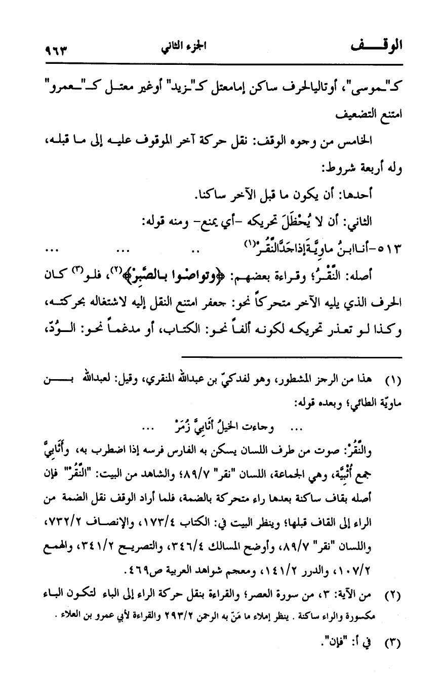 أصله: النَّقْرُ؛ وقراءة بعضهم: {وَتَوَاصَوْا بِالصَّبْرِ} [العصر: 3] فلو كان الحرف الذي يليه الآخر متحركاً نحو: جعفر امتنع النقل إليه لاشتغاله بحركته، وكذا لو تعذر تحريكه لكونه ألفاً نحو: الكتاب، أو مدغماً نحو: الوُدّ،