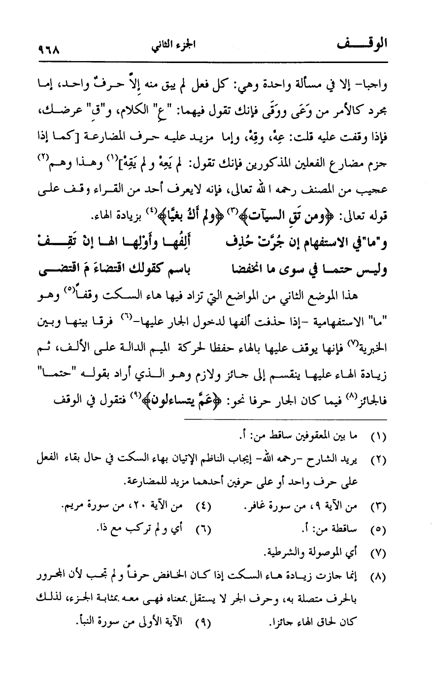 واجباً- إلا في مسألة واحد وهي: كل فعل لم يبق منه إِلا حرف واحد، إما مجرد كالأمر من وَعَى ووَقى فإنك تقول فيهما: "عِ" الكلام، و"قِ" عرضك، فإذا وقفت عليه قلت: عِه، وقِه، وإما مزيد عليه حرف المضارعة [كما إذا جزم مضارع الفعلين المذكورين فإنك تقول: لم يَعِهْ ولم يَقِهْ] وهذا وهم عجيب من المصنف رحمه الله تعالى، فإنك لا يعرف أحد من القراء وقف على قوله تعالى: {وَمَنْ تَقِ السَّيِّئَاتِ} [غافر: 9] {وَلَمْ أَكُ بَغِيًّا} [مريم: 20] بزيادة الهاء.