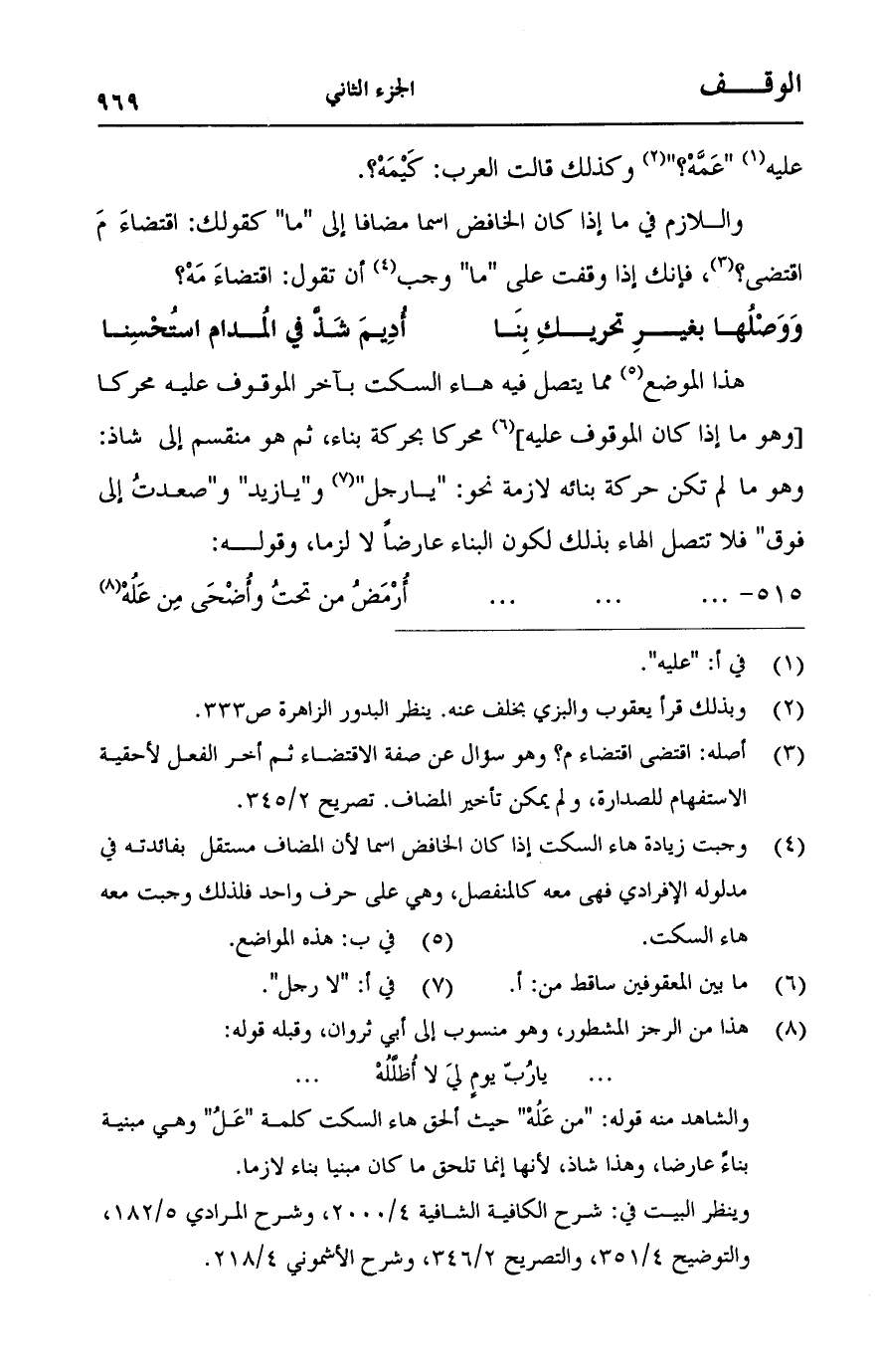واللازم في ما إذا كان الخافض اسما مضافا إلى "ما" كقولك" اقتضاءَ مَ اقتضى؟، فإنك إذا وقفت على "ما" وجب أن تقول: اقتضاءَ مَهْ؟