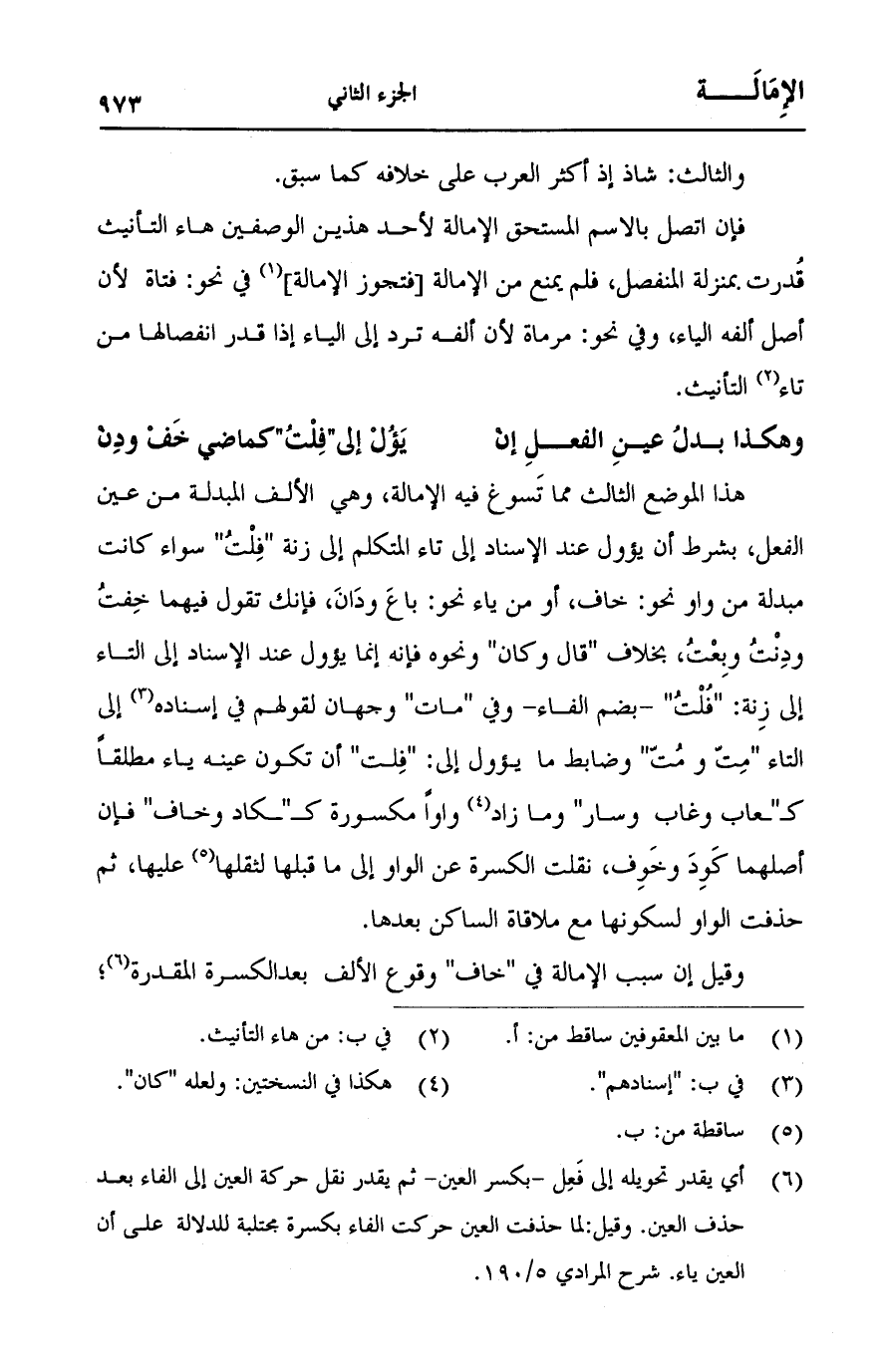 هذا الموضع الثالث مما تَسوغ فيه الإمالة، وهي الألف المبدلة من عين الفعل، بشرط أن يؤول عند الإسناد إلى تاء المتكلم إلى زنة "فِلْتُ" سواء كانت مبدلة من واو نحو: خاف، أو من ياء نحو: باعَ ودَانَ، فإنك تقول فيهما خِفتُ ودِنْتُ وبِعْتُ، بخلاف "قال وكان" ونحوه فإنه إنما يؤول عند الإسناد إلى التاء إلى زِنة: "فُلْتُ" -بضم الفاء" - وفي "مات" وجهان لقولهم في إسناده إلى التاء "مِت ومُت" وضابط ما يؤول إلى: "فِلت" أن تكون عينه ياء مطلقاً كـ"ـعاب وغاب وسار" وما زاد واواً مكسورة كـ"ـكاد وخاف" فإن أصلهما كَوِدَ وخَوِف، نقلت الكسرة عن الواو إلى ما قبلها لثقلها عليها، ثم حذفت الواو لسكونها مع ملاقاة الساكن بعدها.