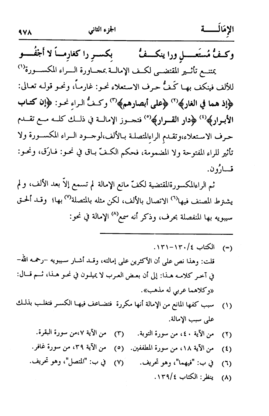 يمتنع تأثير المقتضي لكف الإمالة بمجاورة الراء المكسورة للألف فينكف بها كَفُّ حرف الاستعلاء نحو: غارماً، ونحو قوله تعالى: {إِذْ هُمَا فِي الْغَارِ} [التوبة: 40] {عَلَى أَبْصَارِهِمْ} [البقرة: 7] وكفُّ الراءِ نحو: {إِنَّ كِتَابَ الْأَبْرَارِ} [المطففين: 18] {دَارُ الْقَرَارِ} [غافر: 39] فتجوز الإمالة في ذلك كله مع تقدم حرف الاستعلاء، وتقدم الراءِ المتصلة بالألف، لوجود الراء المكسورة ولا تأثير للراء المفتوح ولا المضمومة، فحكم الكف باق في نحو: فارَق، ونحو: قارُون.