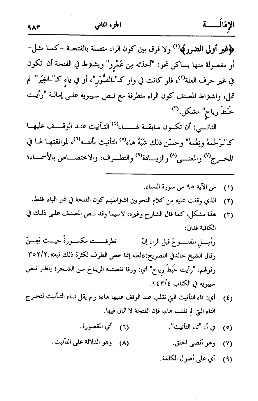 {غَيْرُ أُولِي الضَّرَرِ} [النساء: 95] ولا فرق بين كون الراء متصلة بالفتحة -كما مثل- أو مفصولة منها بساكن نحو: "أخذته مِن عَمْرٍو" ويشترط في الفتحة أن تكون في غير حرف العلة، فلو كانت في واو كـ"ـالصُّوَرِ"، أو ياءٍ كـ"ـالغِيَر" لم تمل، واشتراط المصنف كون الراء متطرفة مع نص سيبويه على إمالة "رأيت خَبَطَ رياحٍ" مشكل.