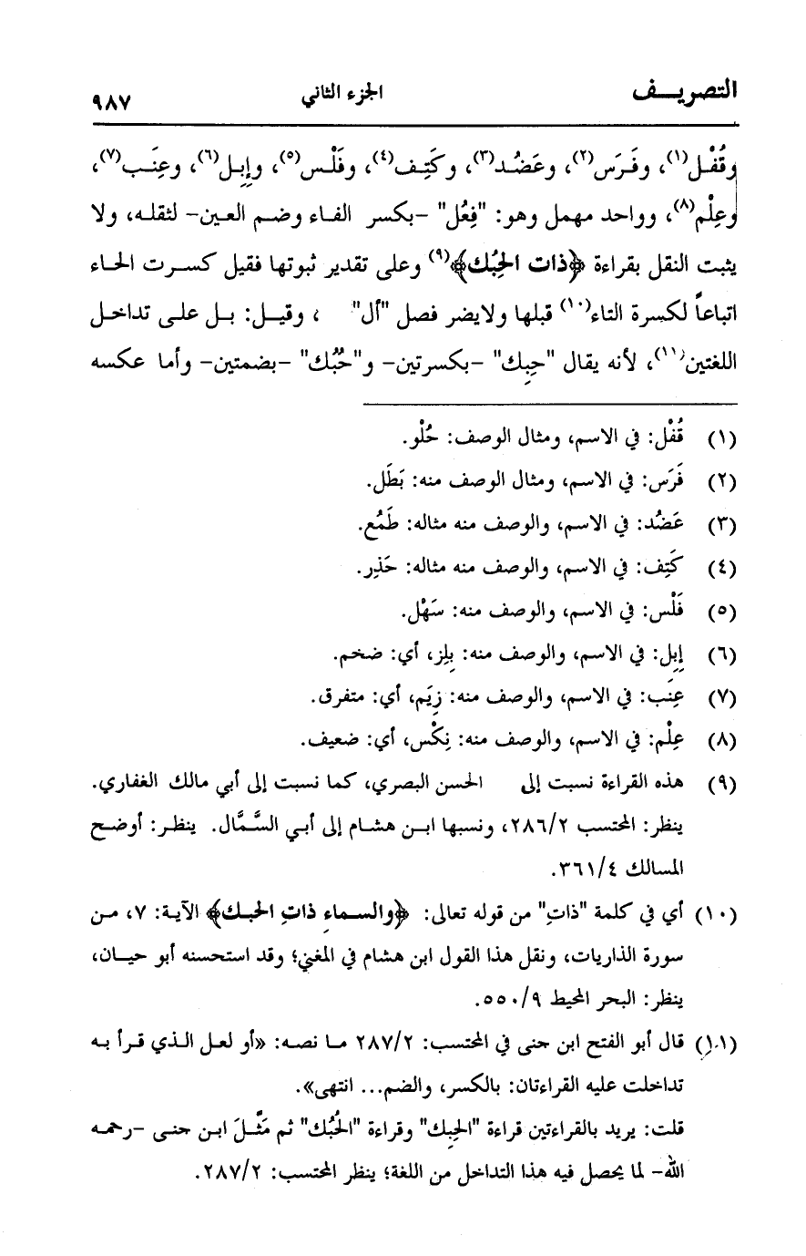 وقُفْل، وفَرَس، وعَضُد، وكَتِف، وفَلْس، وإبل، وعِنَب، وعِلم، وواحد مهمل وهو: "فِعُل" -بكسر الفاء وضم العين - لثقله، ولا يثبت النقل بقراءة {ذَاتِ الْحُبُكِ} [الذرايات: 6] وعلى تقدير ثبوتها فقيل كسرت الحاء اتباعاً لكسرة التاء قبلها ولا يضر فصل "أل"، وقيل: بل على تداخل اللغتين، لأنه يقال "حِبِك" -بكسرتين- و"حُبُك" - بضمتين - وأما عكسه