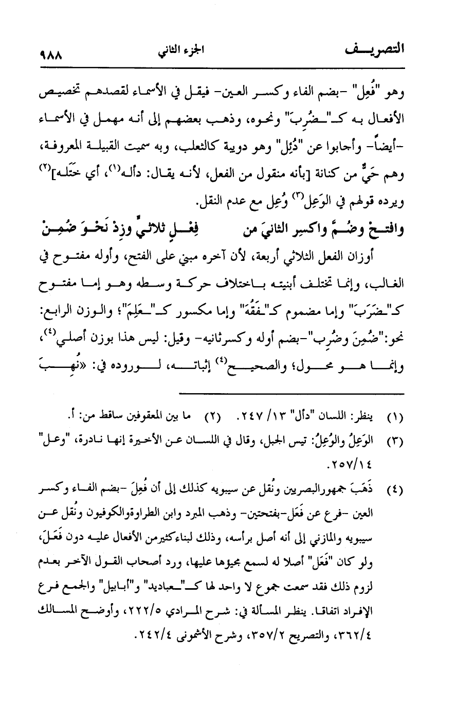 أوزان الفعل الثلاثي أربعة، لأن آخره مبني على الفتح، وأوله مفتوح في الغالب، وإنما تختلف أبنيته حركة وسطه وهو إما مفتوح كـ"ـضَرَبَ" وإما مضموم كـ"ـفَقُهَ" وإما مكسور كـ"ـعَلِمَ"؛ والوزن الرابع: نحو: "ضُمينَ وضُرِب" -بضم أوله وكسر ثانيه- وقيل: ليس هذا بوزن أصلي، وإنما هو محول؛ والصحيح إثباته، لوروده في: "نُهِبَ