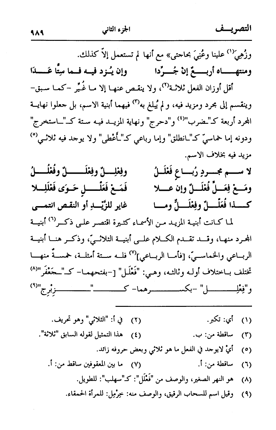 لما كنت أبنية المزيد من الأسماء كثيرة اقتصر على ذكر أبنية المجرد منها، وقد تقدم الكلام على أبنية الثلاثي، وذكر هنا أبنية الرباعي والخماسيّ، [فأما الرباعي] فله ستة أمثلة خمسة منها تختلف باختلاف أوله وثالثع، وهي: فَعْلَل [-بفتحهما - كـ"ـجَعْفَر" و"فِعْلِل" - بكسرهما - كزِبْرِج".