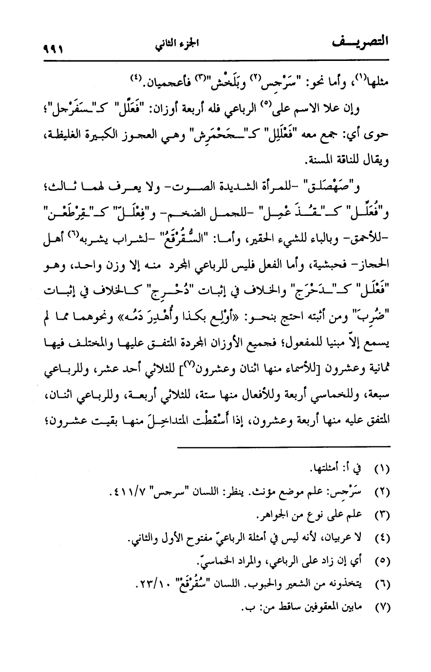 و"صَهْصَلق" -للمرأة الشديدة الصوت- ولا يعرف لهما ثالث؛ و"فُعَلل" كـ"ـقُذَ عْمِل" - للجمل الضخم - و"فِعْلَلَ" كـ"ـقِرْطَعْن" - للأحمق - وبالياء للشيء الحقير، وأما: "السُّقُرقَعُ" - لشراب يشربه أهل الحجاز - فحبشية، وأما الفعل فليس للرباعي المجرد منه إلا وزن واحد، وهو "فَعْلَل" كـ"ـدَحْرَج" والخلاف في إثبات "دُحْرِج" كالخلاف في إثبات "ضُرِبَ" ومن أثبته احتج بنحو: "أوْلِع بكذا وأُهْدِرَ دَمُه" ونحوهما مما لم يسمع إلاّ مبنيا للمفعول؛ فجميع الأوزان المجردة للتفق عليها والمختلف فيها ثمانية وعشرون [للأسماء منها اثنان وعشرون] للثلاثي أحد عشر، وللرباعي سبعة، وللخماسي أربعة وللأفعال منها ستة، للثلاثي أربعة، وللرباعي اثنان، المتفق عليها منها أربعة وعشرون، إذا أَْسقطْت المتداخِلَ منها بقيت عشرون؛