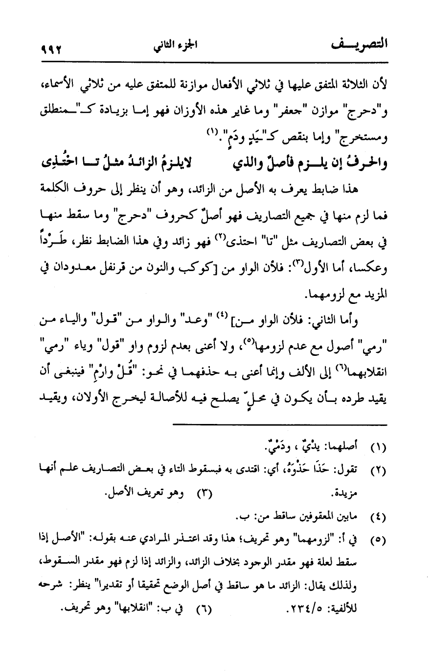 هذا ضابط يعرف به الأصل من الزائد، وهو أن ينظر إلى حروف الكلمة فما لزم منها في جميع التصاريق فهو أصلٌ كحروف "دحرج" وما سقط منها في بعض التصاريف مثل "تا" احتذى فهو زائد وفي هذا الضابط نظر، طَرداً وعكسا، أما الأول: فلأن الواو من [كوكب والنون من قرنفل معدودان في المزيد مع لزومهما.