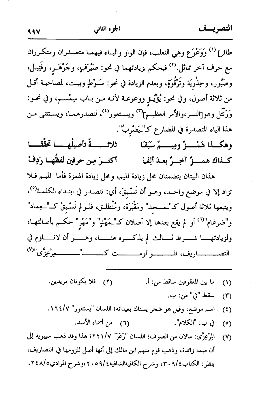 طائر] ووعوَع وهي الثعلب، فإن الواو والياء فيههما متصدران ومتكرران مع حرف آخر مماثل. فيحكم بزيادتهما في نحو: صَيْرَفٍ، وجَوْهَرٍ، وقَتيل، وصبور، وحذْرِية وتَرْقُوَةٍ، وبعدم الزيادة في نحو: سَوْطٍ وبيت، لمصاحبة أقل من ثلاثة أصول، وفي نحو: يُؤيُؤ ووعوعة لأنه من باب سِمْسم، وفي نحو: وَرَنْتَل وهو [النسر، والأمر العظيم] ويستعور، لتصدرهما، ويستثنى من هذا الياء المتصدرة في المضارع كـ"ـيَضْرِبُ".