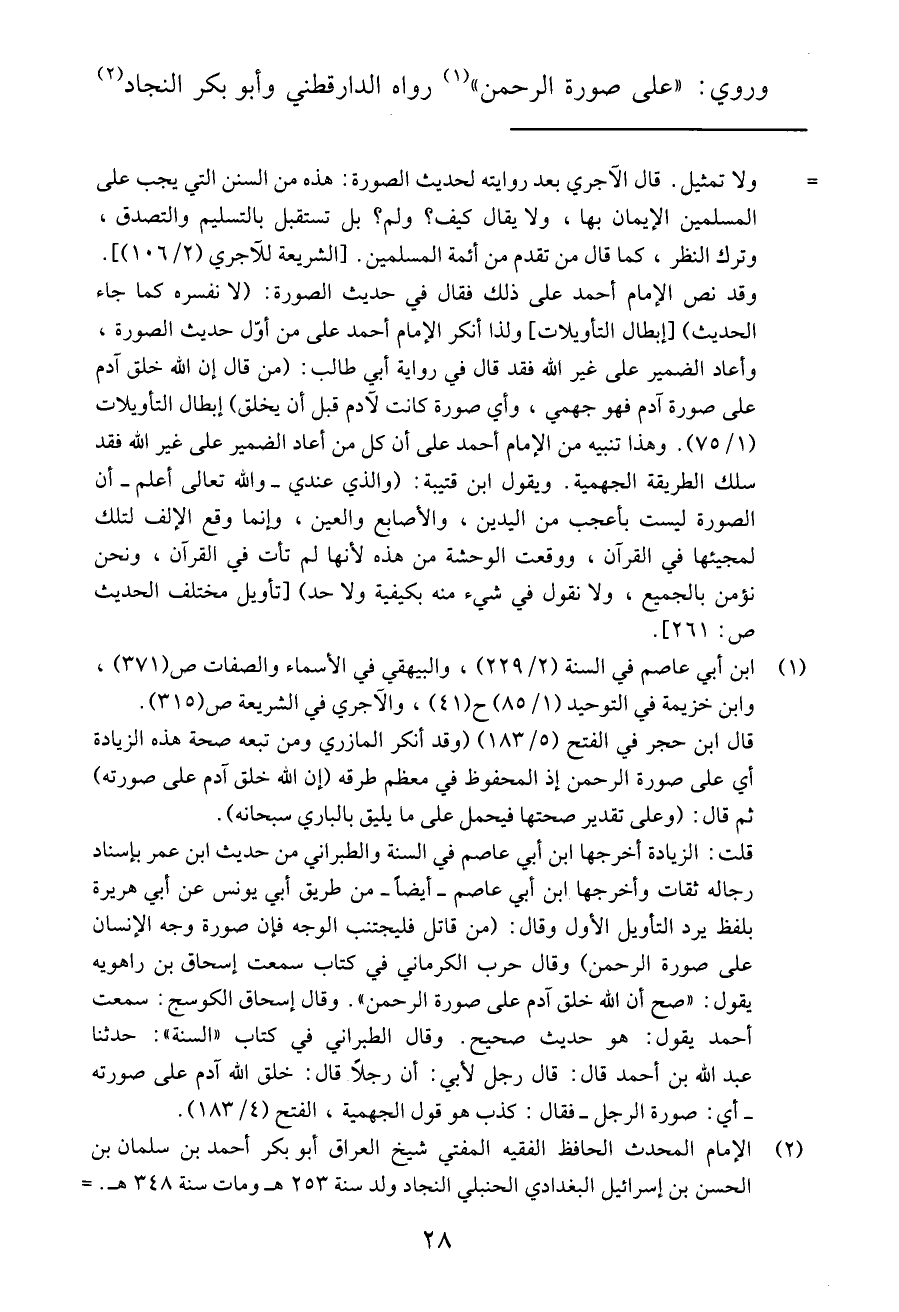 (¬1) ابن أبى عاصم في السنة (2/229) ، والبيهقي في الأسماء والصفات ص (371) ، وابن خزيمة في التوحيد (1/85) ح (41) ، والآجري في الشريعة ص (315) . قال ابن حجر في الفتح (5/183) (وقد أنكر المازري ومن تبعه صحة هذه الزيادة أي على صورة الرحمن إذ المحفوظ في معظم طرقه (إن الله خلق آدم على صورته) ثم قال (وعلى تقدير صحتها فيحمل على ما يليق بالباري سبحانه) . قلت: الزيادة أخرجها ابن أبي عاصم في السنة والطبراني من حديث ابن عمر بإسناد رجاله ثقات وأخرجها ابن أبي عاصم - أيضاً - من طريق أبى يونس عن أبى هريرة بلفظ يرد التأويل الأول وقال: (من قاتل فليجتنب الوجه فإن صورة وجه الإنسان على صورة الرحمن) وقال حرب الكرماني في كتاب سمعت إسحاق بن راهوية يقول: "صح أن الله خلق آدم على صورة الرحمن". وقال إسحاق الكوسج: سمعت أحمد يقول: هو حديث صحيح. وقال الطبراني في كتاب "السنة": حدثنا عبد الله بن أحمد قال: قال رجل لأبي: إن رجلا قال: خلق الله آدم على صورته - أي صورة الرجل - فقال كذب هو قول الجهمية، الفتح (4/183) .