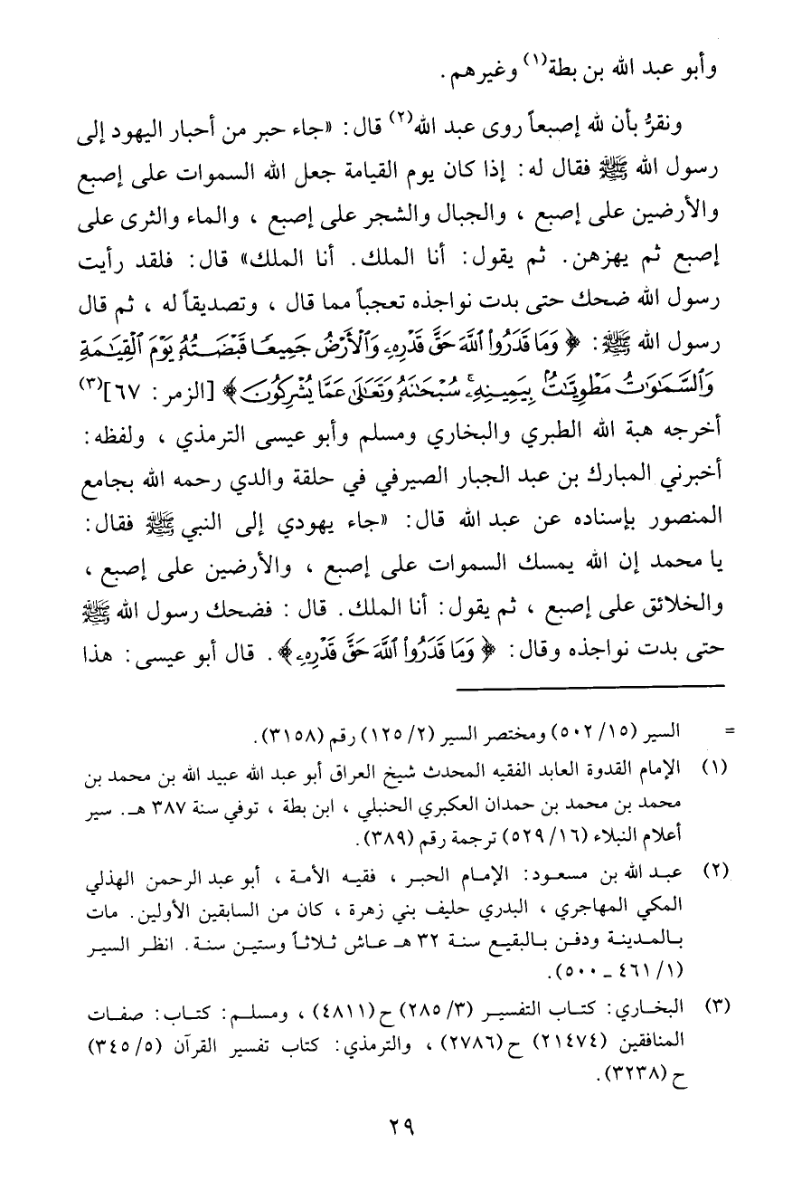 ونقرّ بأن لله إصبعاً روى عبد الله (¬2) قال "جاء حبر من أحبار اليهود إلى رسول الله صلى الله عليه وسلم فقال له: إذا كان يوم القيامة جعل الله السموات على إصبع والأرضين على إصبع، والجبال والشجر على إصبع، والماء والثرى على إصبع ثم يهزهن. ثم يقول: أنا الملك. أنا الملك "قال: فلقد رأيت رسول الله صلى الله عليه وسلم ضحك حتى بدت نواجذه تعجباً مما قال، وتصديقاً له، ثم قال رسول الله صلى الله عليه وسلم: {وَمَا قَدَرُوا اللَّهَ حَقَّ قَدْرِهِ وَالأَرْضُ جَمِيعاً قَبْضَتُهُ يَوْمَ الْقِيَامَةِ وَالسَّمَاوَاتُ مَطْوِيَّاتٌ بِيَمِينِهِ سُبْحَانَهُ وَتَعَالَى عَمَّا يُشْرِكُونَ} [الزمر: 67] (¬3) أخرجه هبة الله الطبري والبخاري ومسلم وأبو عيسى الترمذي، ولفظه: أخبرني المبارك بن عبد الجبار الصيرفي في حلقة والدي رحمه الله بجامع المنصور بإسناده عن عبد الله قال: "جاء يهودي إلى النبي صلى الله وسلم فقال: يا محمد إن الله يمسك السموات على إصبع والأرضين على إصبع، والخلائق على إصبع، ثم يقول: أنا الملك. قال فضحك رسول الله صلى الله عليه حتى بدت نواجذه وقال {وَمَا قَدَرُوا الله حَق قَدْرِهِ} . قال أبو عيسى: هذا