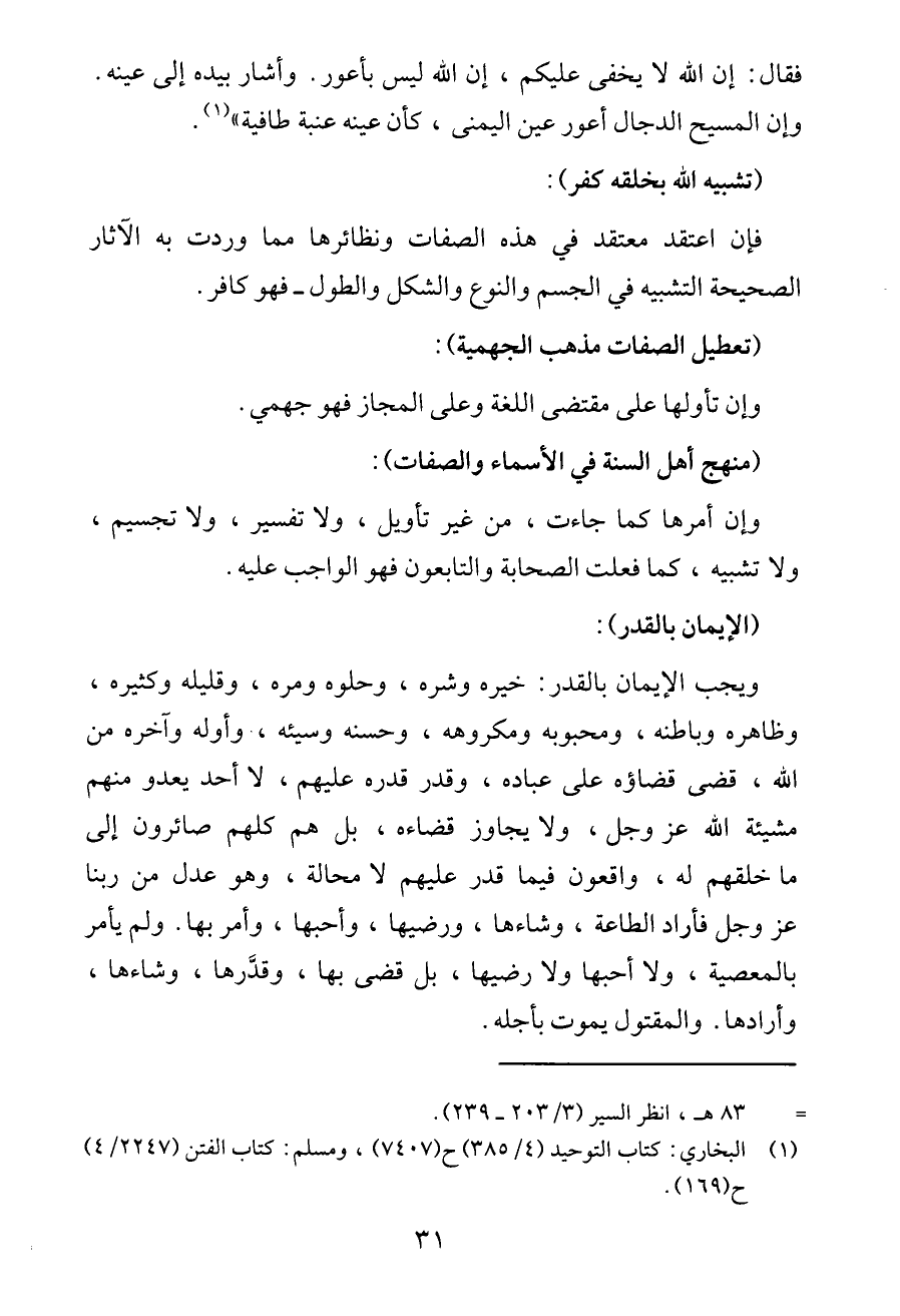 وإن أمرها كما جاءت، من غير تأويل، ولا تفسير، ولا تجسيم، ولا تشبيه، كما فعلت الصحابة والتابعون فهو الواجب عليه.