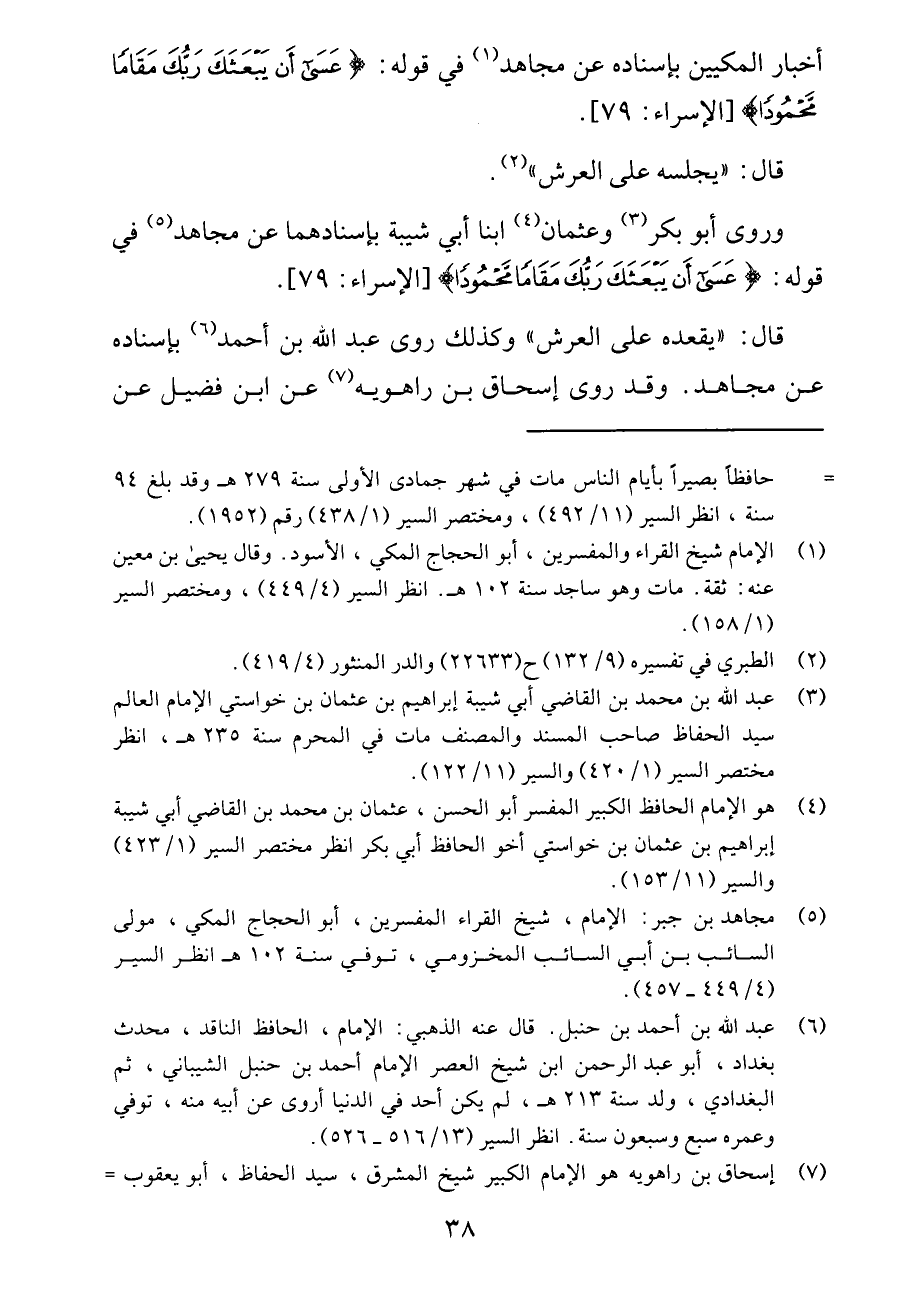 أخبار المكيين بإسناده عن مجاهد (¬1) في قوله: {عَسَى أَنْ يَبْعَثَكَ رَبُّكَ مَقَاماً مَحْمُوداً} [الإسراء:79] قال: " يجلسه على العرش " (¬2) .