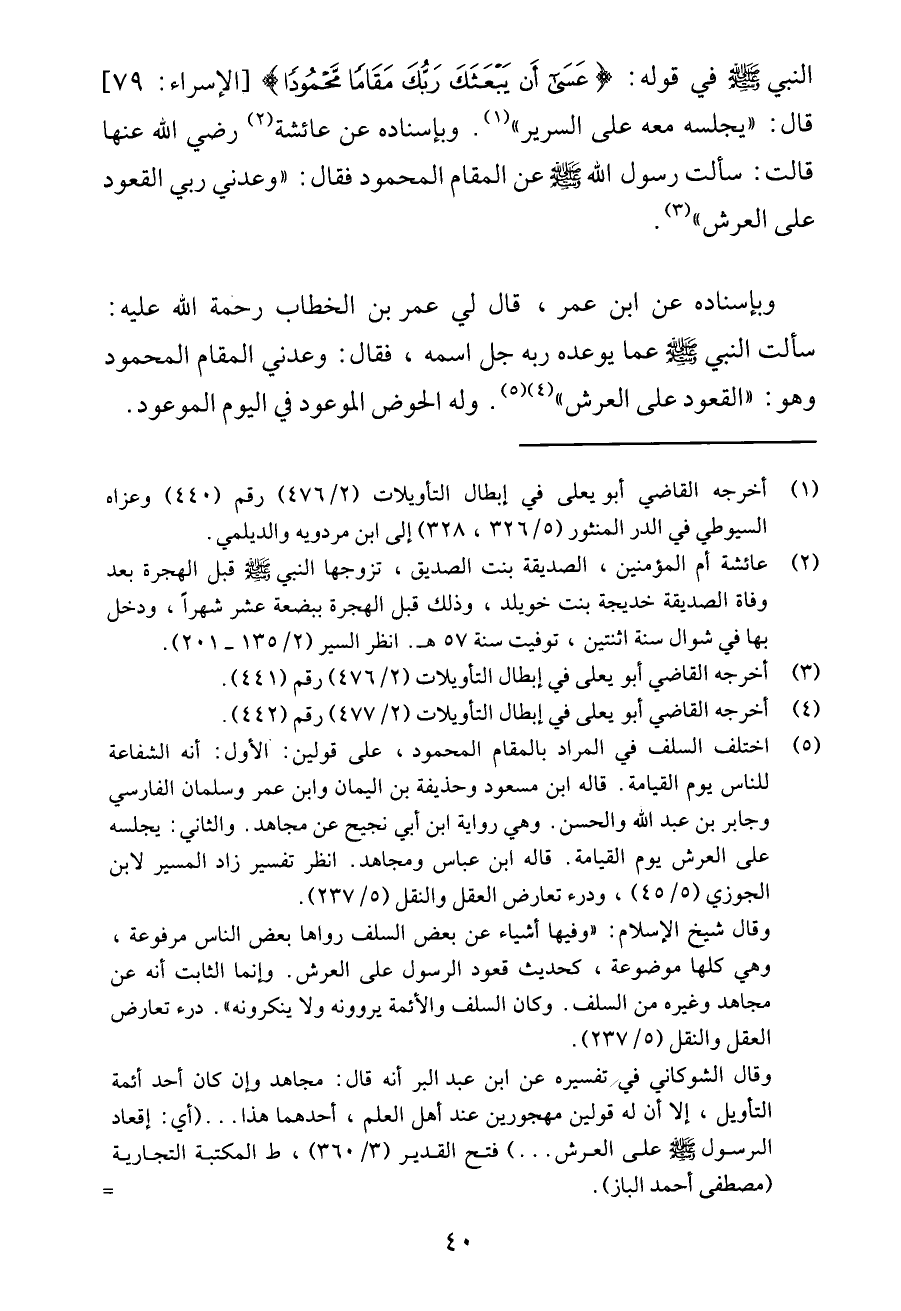 (¬5) اختلف السلف في المراد بالمقام المحمود، على قولين: الأول: أنه الشفاعة للناس يوم القيامة. قاله ابن مسعود وحذيفة بن اليمان وابن عمر وسلمان الفارسي وجابر بن عبد الله والحسن. وهي رواية ابن أبى نجيح عن مجاهد. والثاني: يجلسه علي العرش يوم القيامة. قاله ابن عباس ومجاهد. انظر تفسير زاد المسير لابن الجوزي (5/45) ، ودرء تعارض العقل والنقل (5/237) . وقال شيخ الإسلام: "وفيها أشياء عن بعض السلف رواها بعض الناس مرفوعة، وهي كلها موضوعة، كحديث قعود الرسول على العرش. وإنما الثابت أنه عن مجاهد وغيره من السلف. وكان السلف والأئمة يروونه ولا ينكرونه". درء تعارض العقل والنقل (5/237) . وقال الشوكاني في تفسيره عن ابن عبد البر أنه قال: مجاهد وإن كان أحد أئمة التأويل، إلا أن له قولين مهجورين عند أهل العلم، أحدهما هذا ... (أي: إقعاد الرسول صلى الله عليه وسلم على العرش ... ) فتح القدير (3/360) ، ط المكتبة التجارية (مصطفى احمد الباز) . ولم يذكر ابن كثير في تفسيره إلا أن المقام المحمود هو الشفاعة العظمي، وكذلك فعل السعدي في تفسيره، وهو الذي رجحه الطبري رحمه الله، وعليه أكثر السلف.